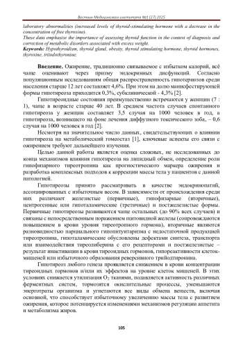 В работе исследуются механизмы, через которые дисфункция щитовидной железы провоцирует метаболические нарушения: замедление основного обмена, угнетение липолиза, усиление липогенеза и накопление жировой ткани. Особое внимание в исследовании уделено тиреотропному гормону как ключевому маркеру гипотиреоза и его влиянию на резистентность к снижению массы тела. Анализируются клинические проявления у пациентов с ожирением на фоне гипотиреоза, включая как неспецифические признаки (хроническая усталость, склонность к отекам), так и специфические лабораторные отклонения (повышенный уровень тиреотропного гормона при снижении концентрации свободного тироксина). Эти данные подчеркивают важность оценки функции щитовидной железы в контексте диагностики и коррекции метаболических нарушений, связанных с избыточным весом.