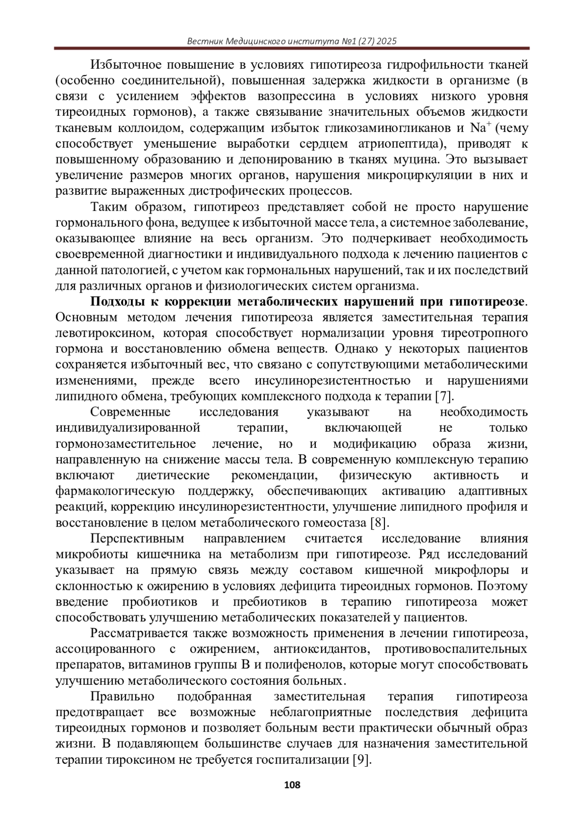 7. Симонова, О.В. Современные методы коррекции метаболических нарушений при заболеваниях щитовидной железы// Российский медицинский журнал. - URL: https://lyl.14341/rmj2024.0019 (2024 г.). DOI: 10.14341/rmj2024.0019(2024