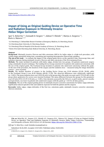 Актуальность. Малоинвазивная корригирующая остеотомия при вальгусной деформации первого пальца стопы является высокотехнологичным вмешательством, отдельные этапы которого могут быть длительными и требуют интраоперационного флюороскопического контроля.