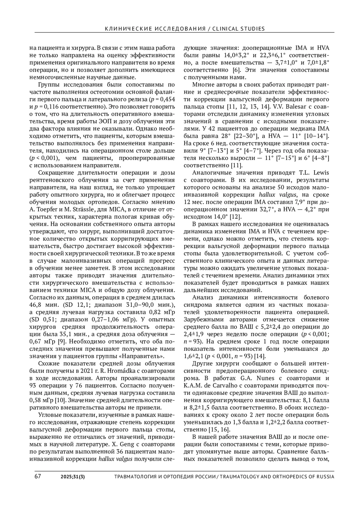 Материал и методы. В исследовании приняли участие 42 пациента с hallux valgus, разделенные на две группы. Все пациенты были прооперированы с использованием малоинвазивной хирургической техники. В группу «Направитель» вошел 21 пациент (21 стопа), которым была выполнена остеотомия с применением оригинального направителя. Пациентам группы «Свободная рука» (21 пациент, 21 стопа) остеотомия выполнялась без использования направителя. После завершения операции регистрировали ее длительность, а также дозу рентгеновского излучения, измеренную с помощью датчиков электронно-оптического преобразователя.