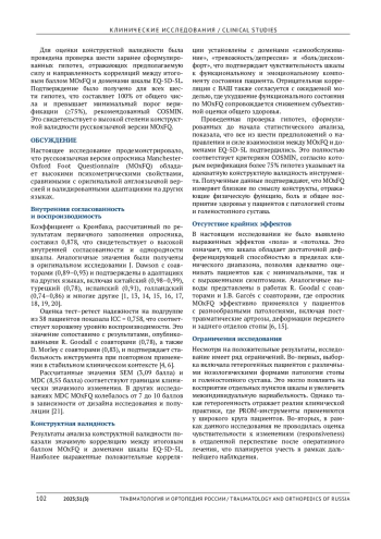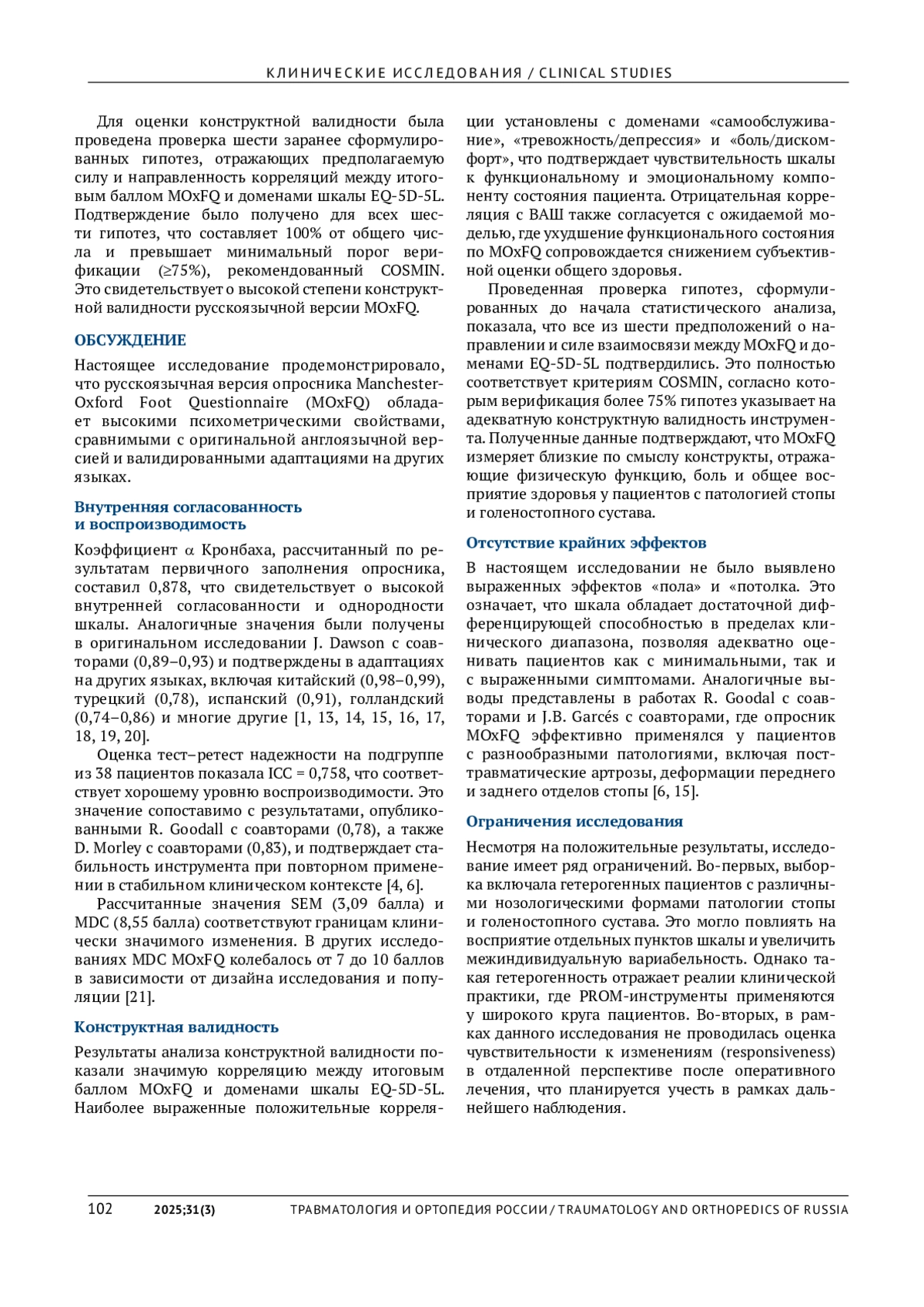 Результаты. Русская версия MOxFQ показала высокую внутреннюю согласованность (α = 0,878) и хорошую воспроизводимость (ICC = 0,758). SEM составила 3,09 балла; MDC — 8,55 балла. Эффекты «пола» и «потолка» отсутствовали. Обнаружены значимые корреляции между итоговыми баллами MOxFQ и доменами EQ-5D-5L (ρ = 0,599–0,745; p < 0,001), а также с ВАШ (ρ = -0,564; p < 0,001).