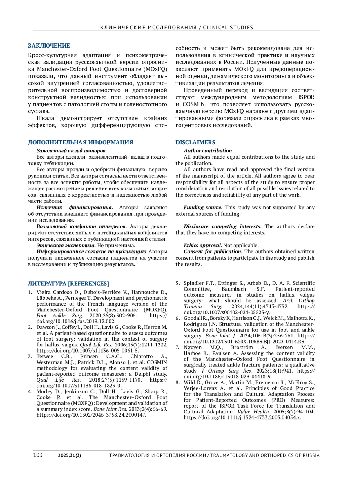 6. Goodall R., Borsky K, Harrison C.J., Welck M., Malhotra K., Rodrigues J.N. Structural validation of the Manchester-Oxford Foot Questionnaire for use in foot and ankle surgery. Bone Joint J. 2024;106-B(3):256-261. DOI: 10.1302/0301-620X.106B3.BJJ-2023-0414.R3