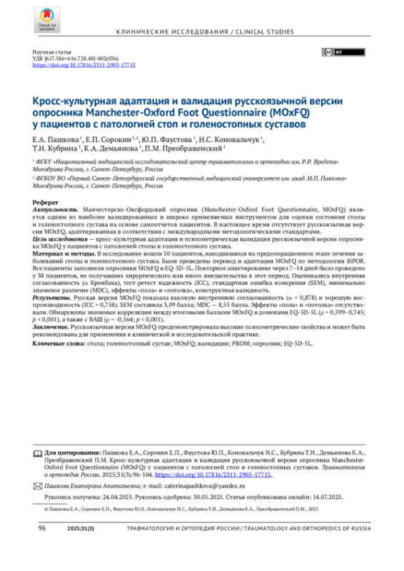 Цель исследования — кросс-культурная адаптация и психометрическая валидация русскоязычной версии опросника MOxFQ у пациентов с патологией стопы и голеностопного сустава.