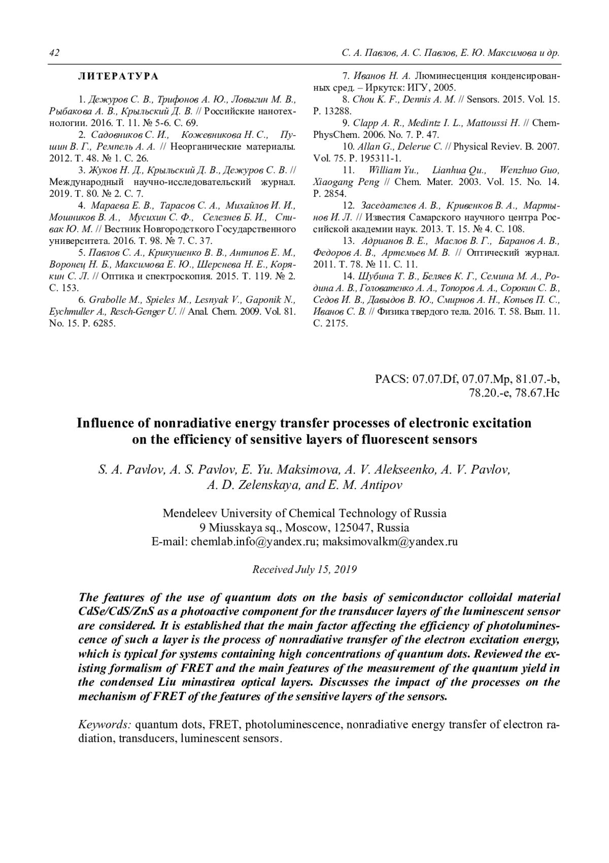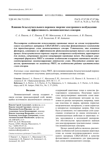 Павлов С. А., Павлов А. С., Максимова Е. Ю., Алексеенко А. В., Павлов А. В., Зеленская А. Д., Антипов Е. М. Влияние безызлучательного переноса энергии электронного возбуждения на эффективность люминесцентных сенсоров 37