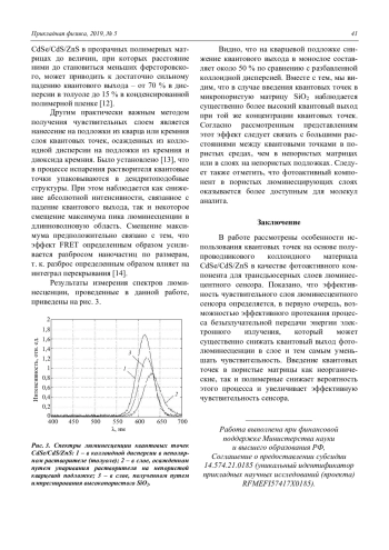 В работе рассмотрены особенности использования квантовых точек на основе полупроводникового коллоидного материала CdSe/CdS/ZnS в качестве фотоактивного компонента для трансдьюсерных слоев люминесцентного сенсора. Показано, что эффективность чувствительного слоя люминесцентного сенсора определяется, в первую очередь, возможностью эффективного протекания процесса безызлучательной передачи энергии электронного излучения, который может существенно снижать квантовый выход фотолюминесценции в слое и тем самым уменьшать чувствительность. Введение квантовых точек в пористые матрицы как неорганические, так и полимерные снижает вероятность этого процесса и увеличивает эффективную чувствительность сенсора.