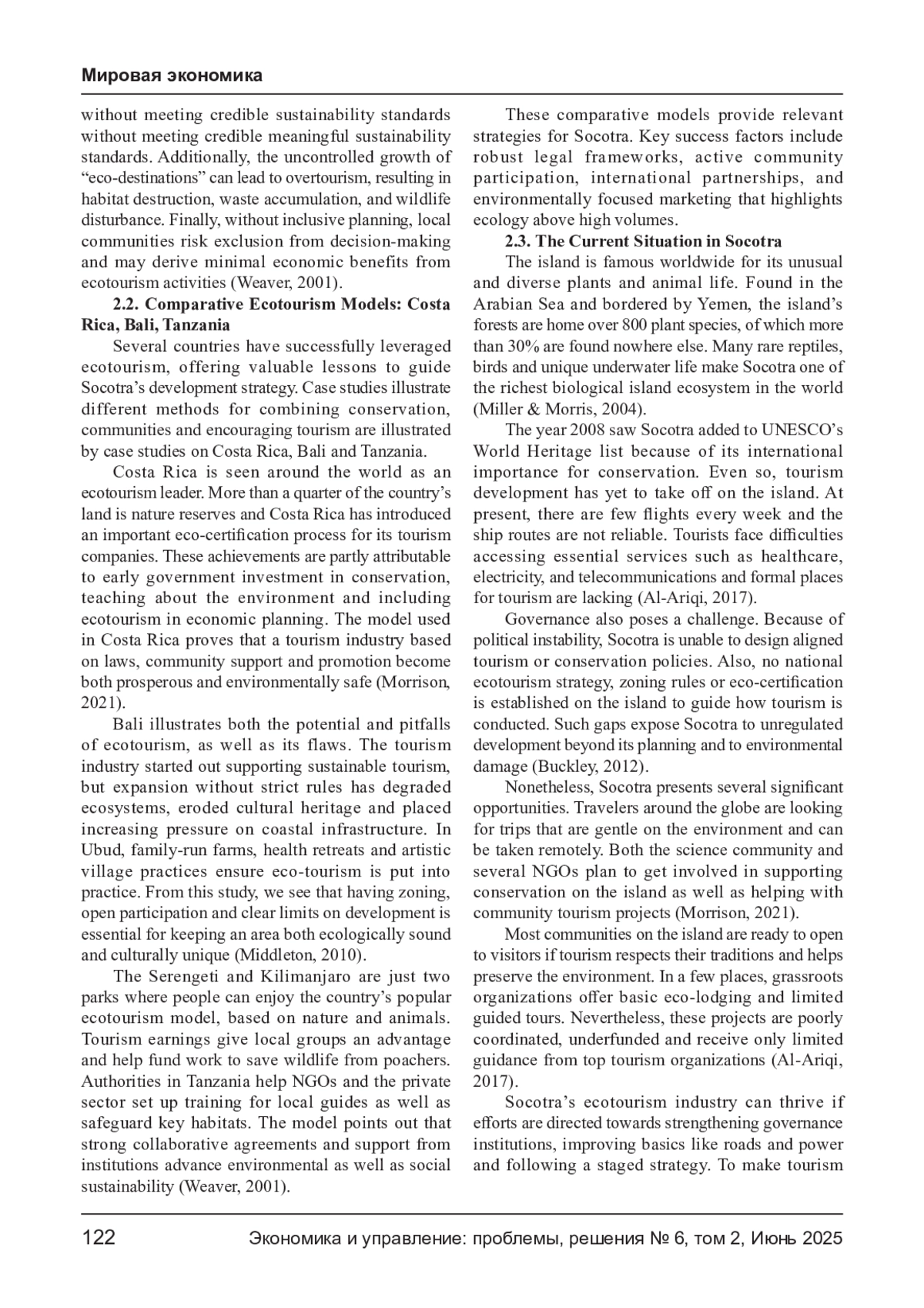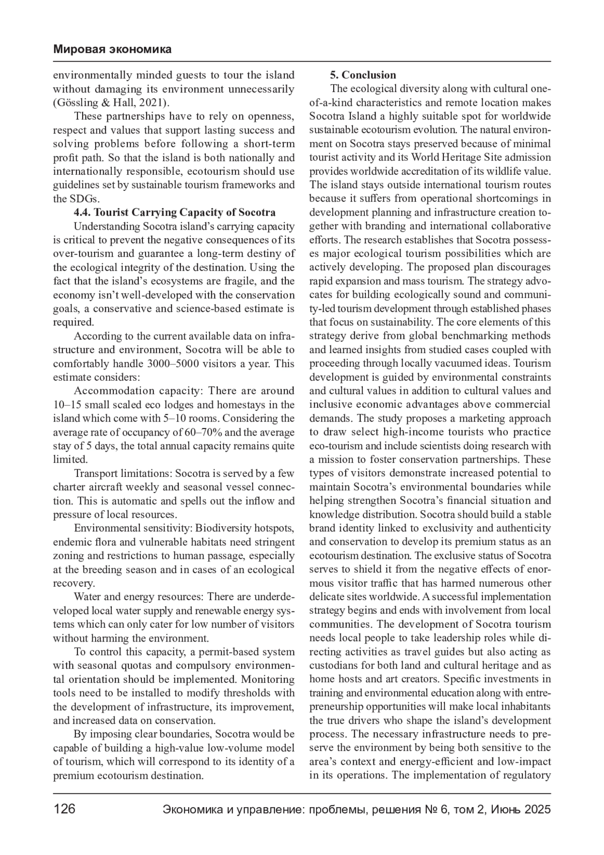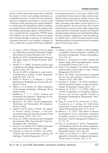 Остров Сокотра, расположенный в Аравийском море и находящийся под юрисдикцией Йемена, обладает исключительной экологической ценностью — более 30% его растений являются эндемиками. Несмотря на то, что ЮНЕСКО признала его объектом всемирного наследия в 2008 году, инфраструктура, политическая нестабильность и недостаточная глобальная осведомлённость препятствуют развитию экотуризма. В исследовании используется качественный подход и SWOT-анализ для оценки экологической, экономической и политической ситуации на Сокотре. Также рассмотрены успешные модели экотуризма в Коста- Рике, Мадагаскаре и на Галапагосских островах. Выводы показывают основные сильные стороны Сокотры: уникальное биоразнообразие, культурное наследие и удалённость от массового туризма. Основные барьеры — ограниченный транспорт, слабое управление и нехватка кадров. Возможности включают мировой интерес к устойчивому туризму и между народное сотрудничество. Исследование предлагает маркетинговые стратегии, ориентированные на экологическую устойчивость, такие как цифровое продвижение, маломасштабные эко-гостиницы и вовлечение местного населения.