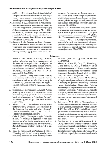 1. Serrai S., Houssem L. Housing policy, relocation and land management at the core of metropolization in Algiers: an exploration of urban planning through artificial and collective intelligence [Электронный ресурс]. - 10.24412/2658-3569-2024-4-119-141 (дата обращения: 02.06.2025). DOI: 10.24412/2658-3569-2024-4-119-141(