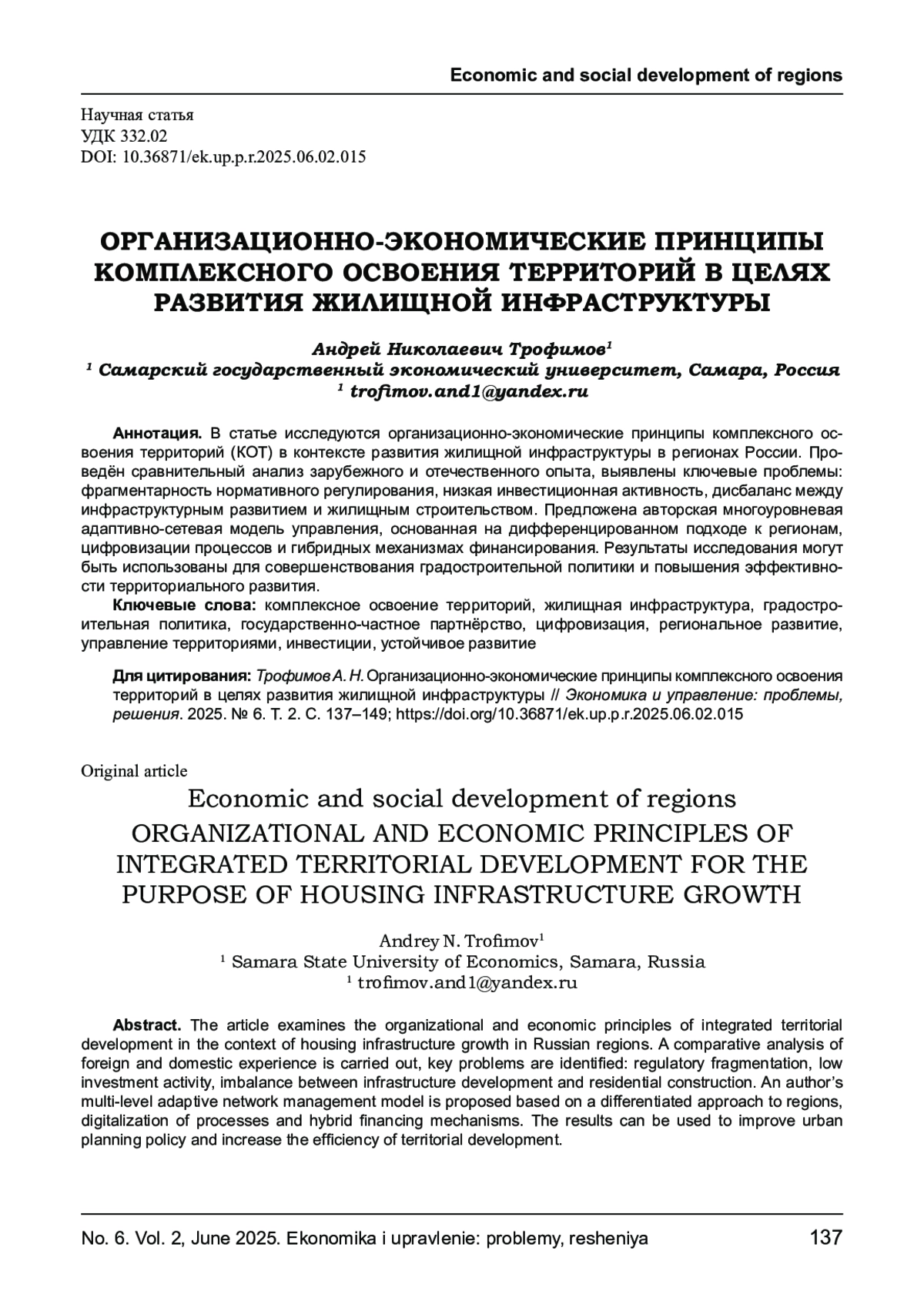 В статье исследуются организационно- экономические принципы комплексного освоения территорий (КОТ) в контексте развития жилищной инфраструктуры в регионах России. Проведён сравнительный анализ зарубежного и отечественного опыта, выявлены ключевые проблемы: фрагментарность нормативного регулирования, низкая инвестиционная активность, дисбаланс между инфраструктурным развитием и жилищным строительством. Предложена авторская многоуровневая адаптивно- сетевая модель управления, основанная на дифференцированном подходе к регионам, цифровизации процессов и гибридных механизмах финансирования. Результаты исследования могут быть использованы для совершенствования градостроительной политики и повышения эффективности территориального развития.