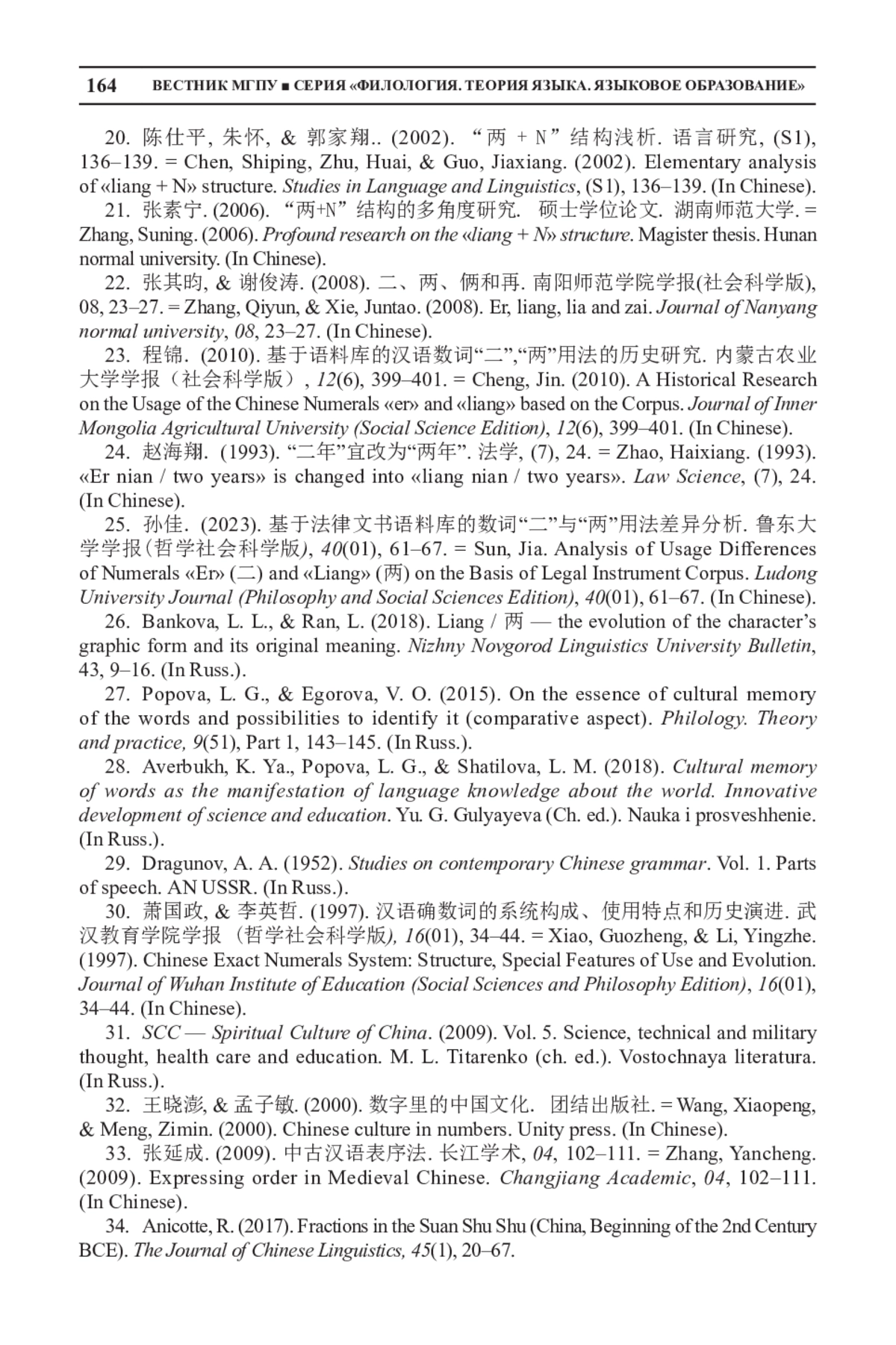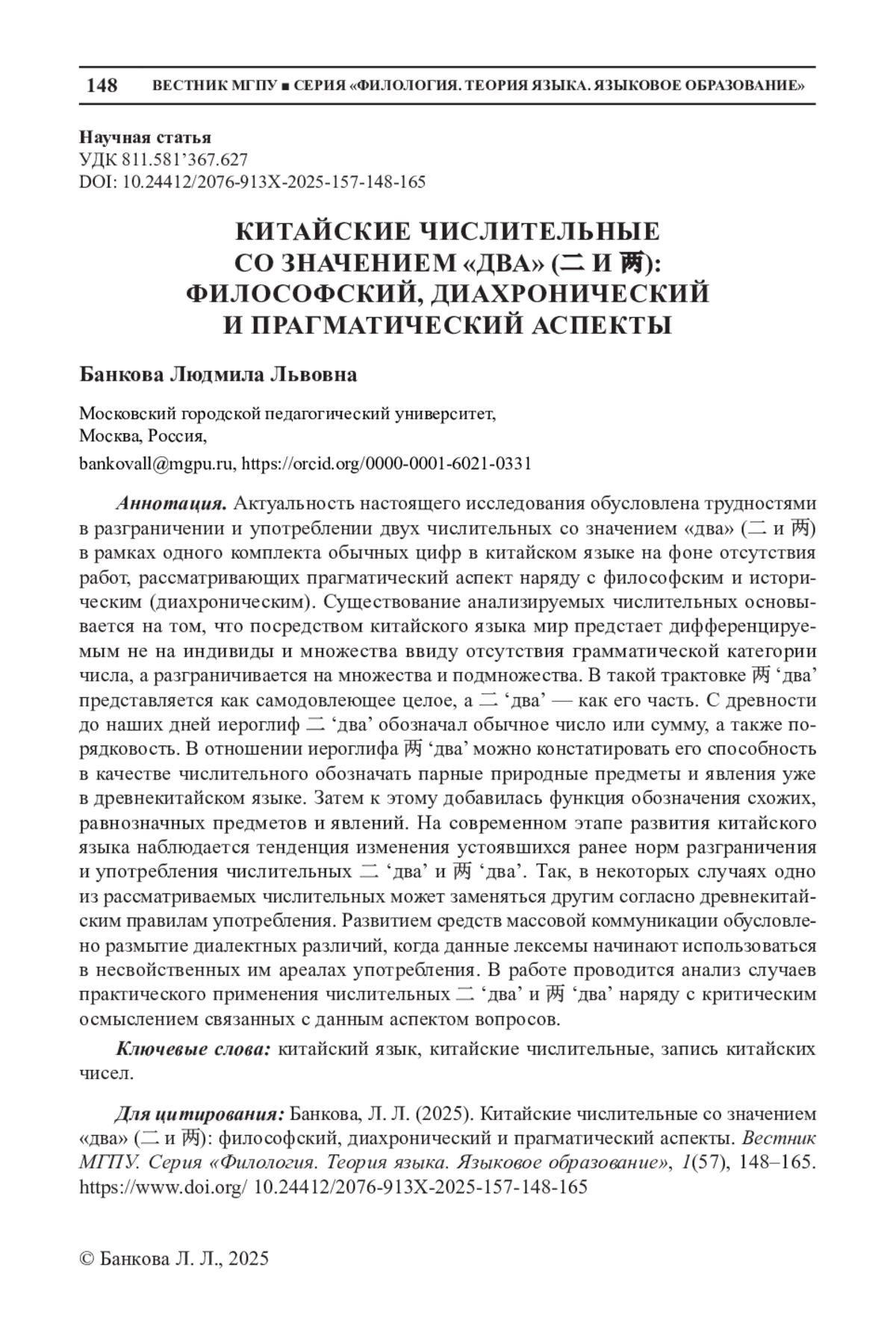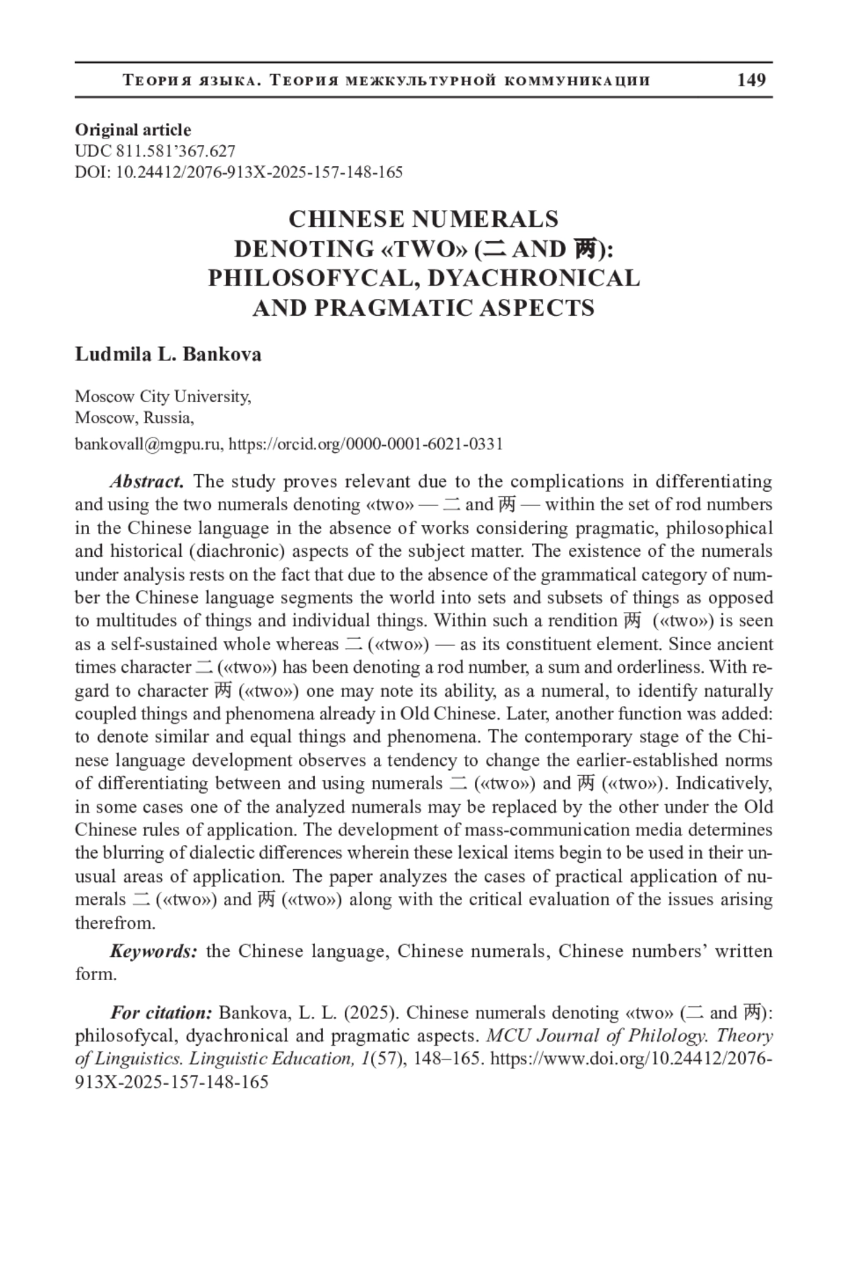 БАНКОВА Л. Л. КИТАЙСКИЕ ЧИСЛИТЕЛЬНЫЕ СО ЗНАЧЕНИЕМ «ДВА»: ФИЛОСОФСКИЙ, ДИАХРОНИЧЕСКИЙ И ПРАГМАТИЧЕСКИЙ АСПЕКТЫ // ВЕСТНИК МГПУ. СЕРИЯ: ФИЛОЛОГИЯ. ТЕОРИЯ ЯЗЫКА. ЯЗЫКОВОЕ ОБРАЗОВАНИЕ. 2025. № 1 (57)
