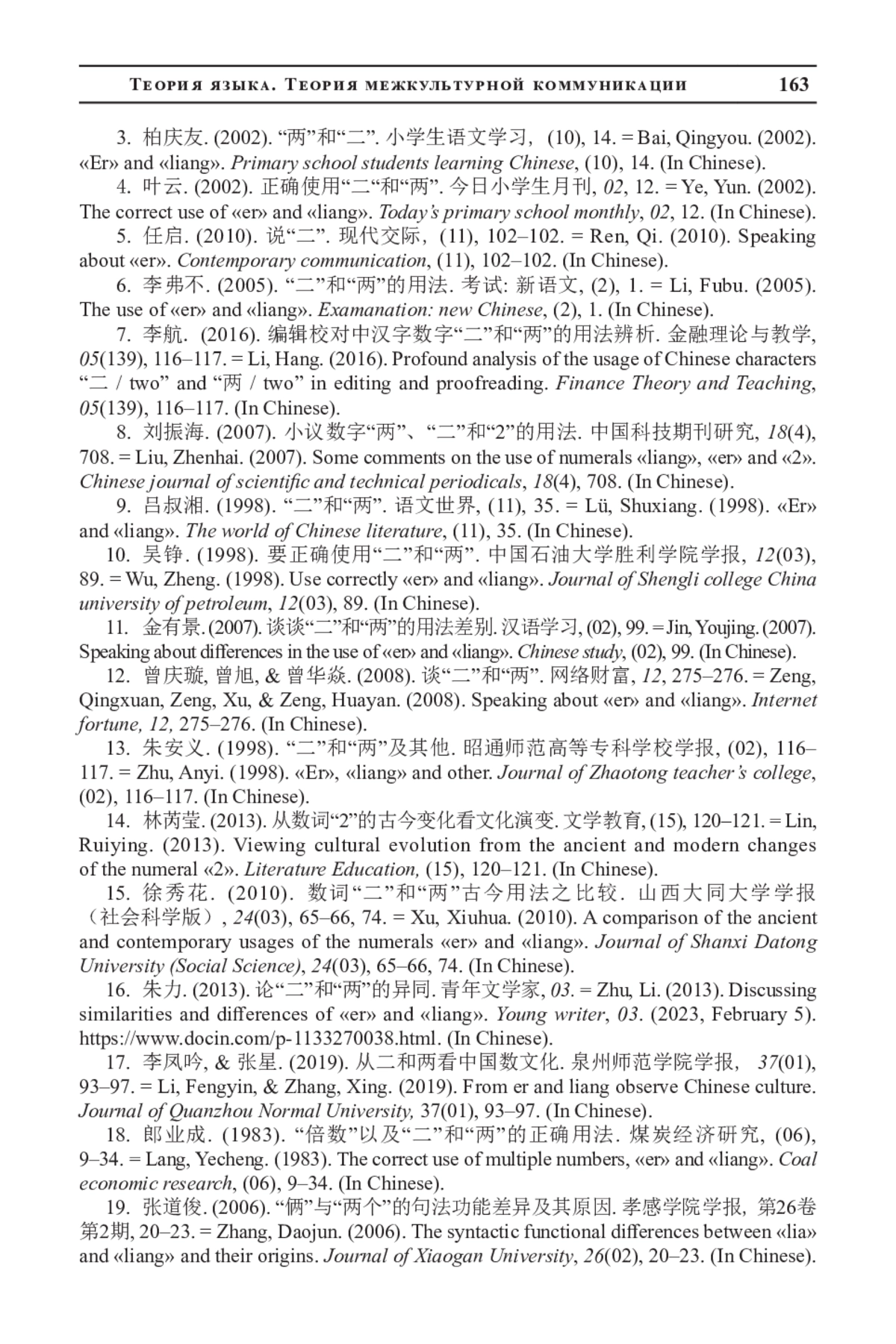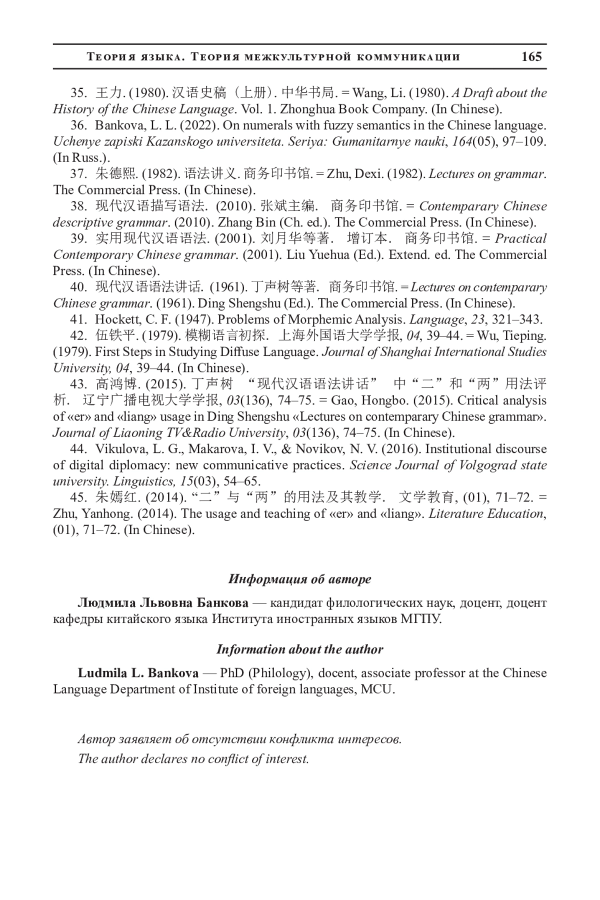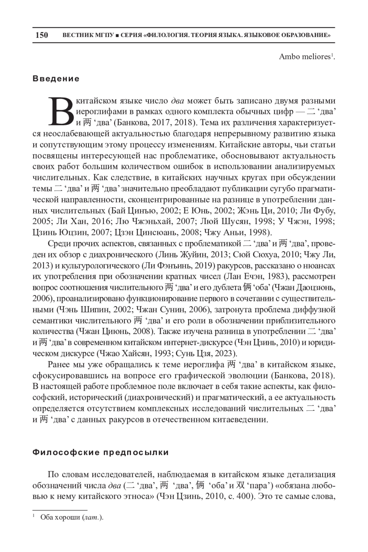 БАНКОВА Л. Л. КИТАЙСКИЕ ЧИСЛИТЕЛЬНЫЕ СО ЗНАЧЕНИЕМ «ДВА»: ФИЛОСОФСКИЙ, ДИАХРОНИЧЕСКИЙ И ПРАГМАТИЧЕСКИЙ АСПЕКТЫ // ВЕСТНИК МГПУ. СЕРИЯ: ФИЛОЛОГИЯ. ТЕОРИЯ ЯЗЫКА. ЯЗЫКОВОЕ ОБРАЗОВАНИЕ. 2025. № 1 (57)