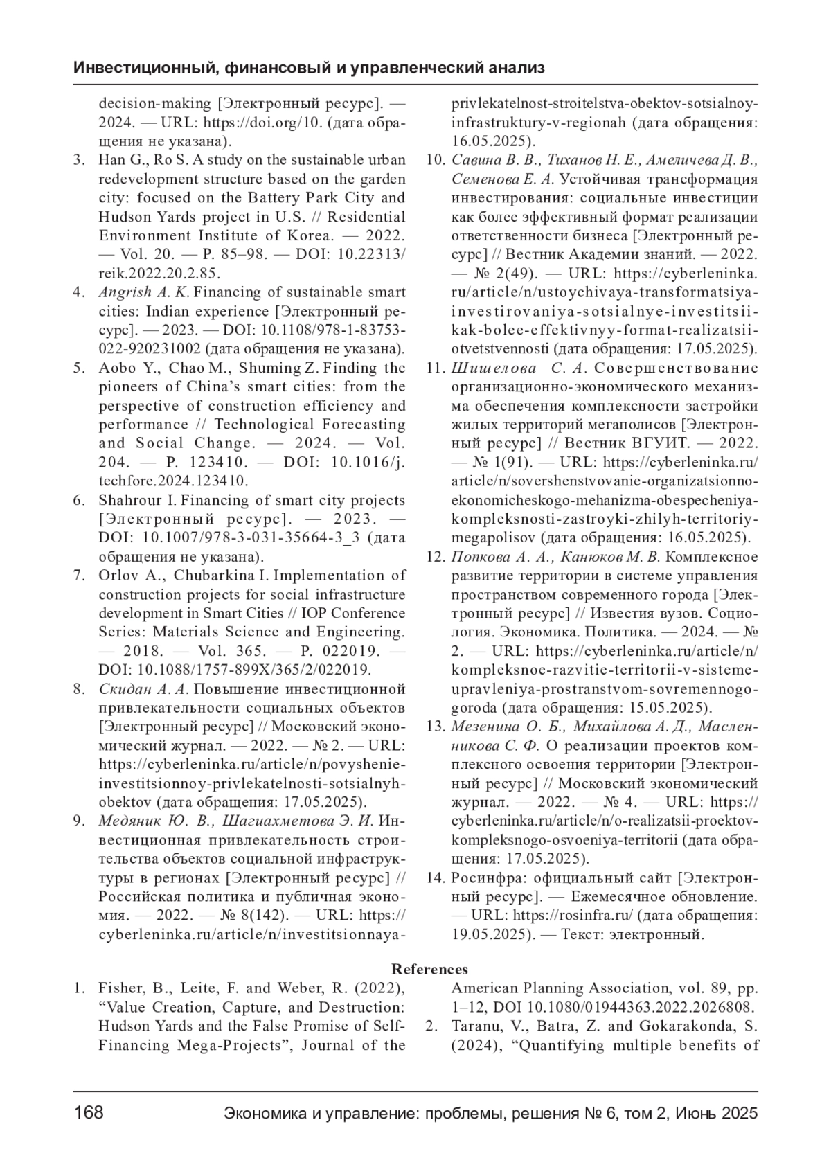 1. Fisher B., Leite F., Weber R. Value creation, capture, and destruction: Hudson Yards and the false promise of self-financing mega-projects // Journal of the American Planning Association. - 2022. - Vol. 89. - P. 1-12. -. DOI: 10.1080/01944363.2022.2026808 EDN: AOCPOY