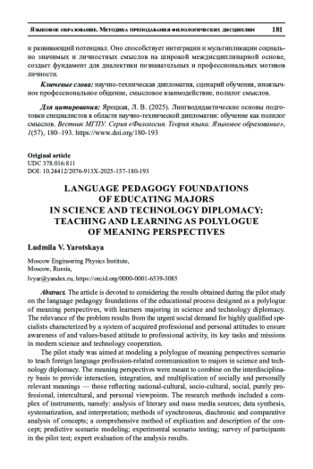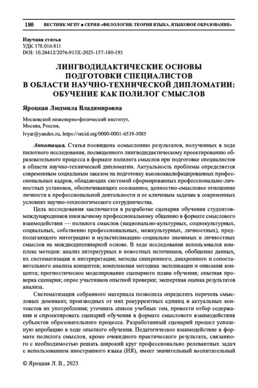 Статья: ЛИНГВОДИДАКТИЧЕСКИЕ ОСНОВЫ ПОДГОТОВКИ СПЕЦИАЛИСТОВ В ОБЛАСТИ НАУЧНО-ТЕХНИЧЕСКОЙ ДИПЛОМАТИИ: ОБУЧЕНИЕ КАК ПОЛИЛОГ СМЫСЛОВ (2025)