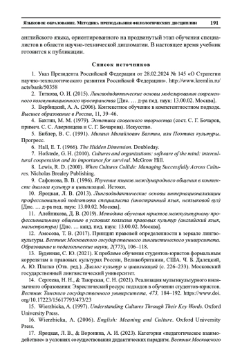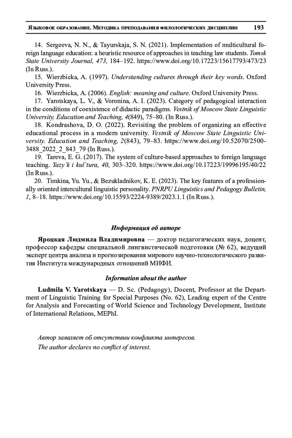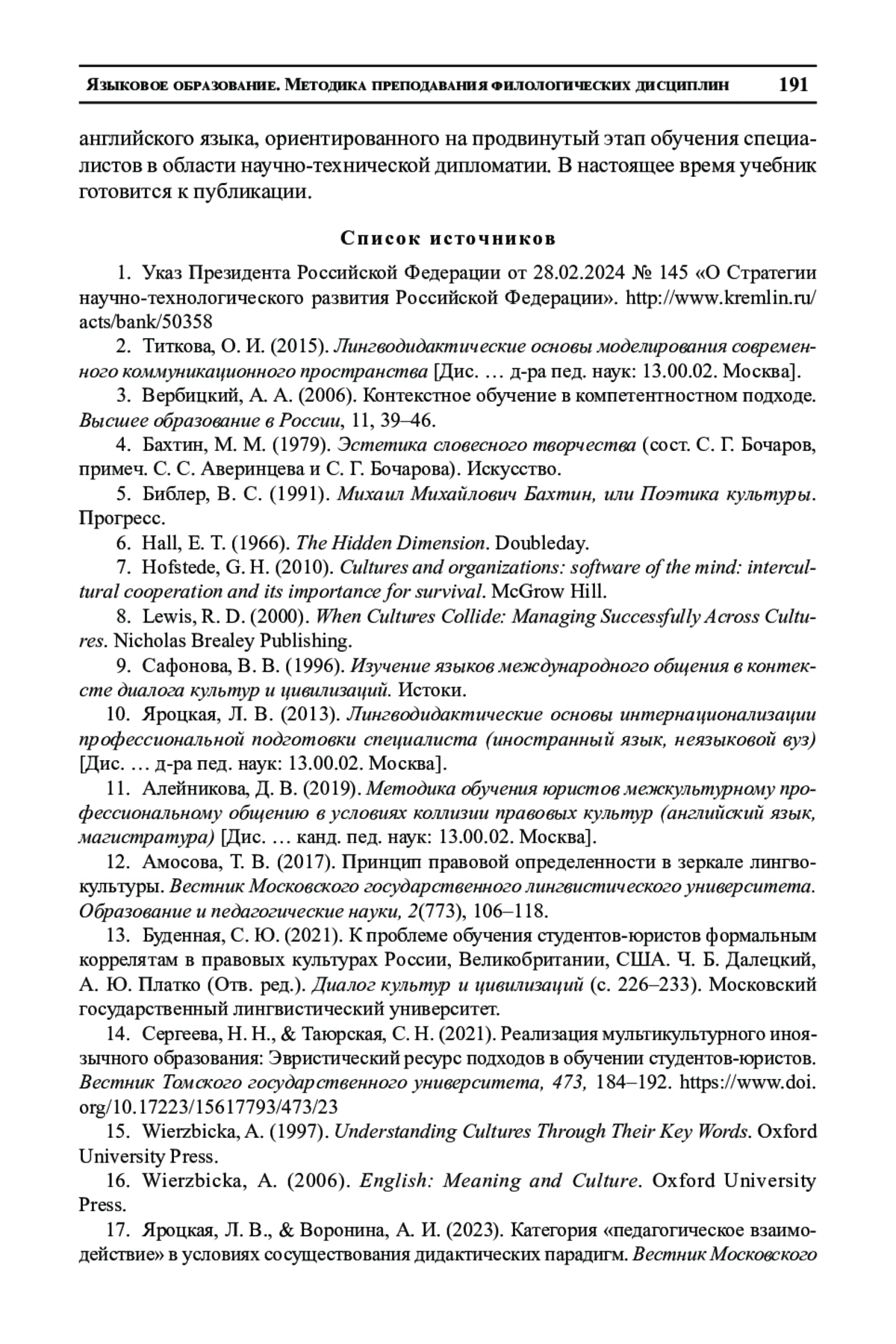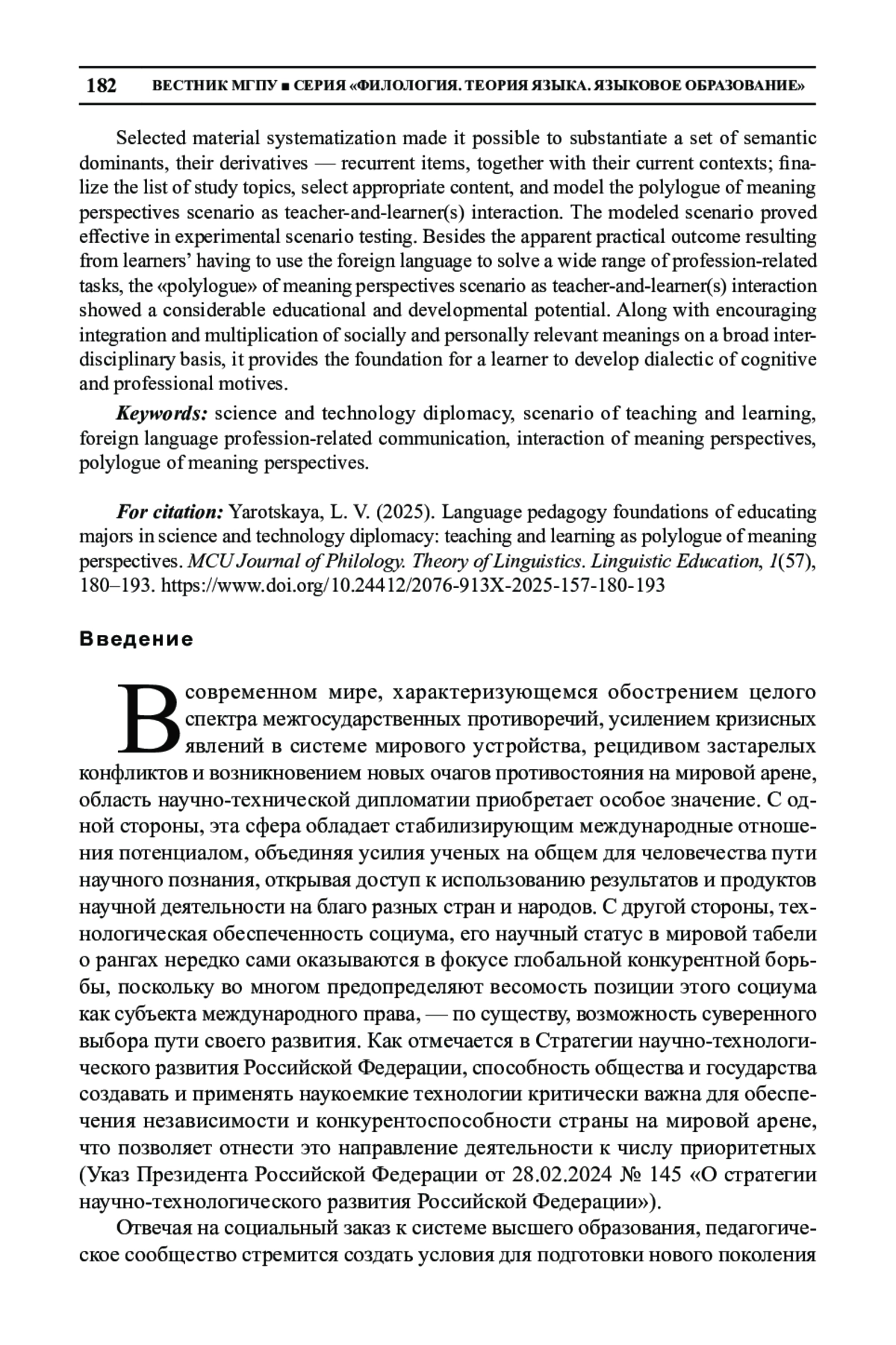 ЯРОЦКАЯ Л. В. ЛИНГВОДИДАКТИЧЕСКИЕ ОСНОВЫ ПОДГОТОВКИ СПЕЦИАЛИСТОВ В ОБЛАСТИ НАУЧНО-ТЕХНИЧЕСКОЙ ДИПЛОМАТИИ: ОБУЧЕНИЕ КАК ПОЛИЛОГ СМЫСЛОВ // ВЕСТНИК МГПУ. СЕРИЯ: ФИЛОЛОГИЯ. ТЕОРИЯ ЯЗЫКА. ЯЗЫКОВОЕ ОБРАЗОВАНИЕ. 2025. № 1 (57)