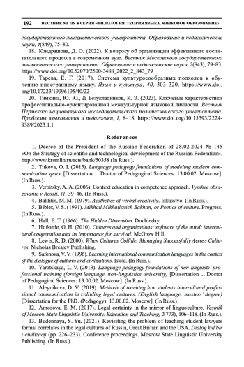 Статья посвящена осмыслению результатов, полученных в ходе пилотного исследования, посвященного лингводидактическому проектированию образовательного процесса в формате полилога смыслов при подготовке специалистов в области научно-технической дипломатии. Актуальность проблемы определяется современным социальным заказом на подготовку высококвалифицированных профессиональных кадров, обладающих системой сформированных профессионально-личностных установок, обеспечивающих осознанное, ценностно-смысловое отношение личности к профессиональной деятельности и ее ключевым задачам в современных условиях научно-технологического сотрудничества. Цель исследования заключается в разработке сценария обучения студентов-международников иноязычному профессиональному общению в формате смыслового взаимодействия - полилога смыслов (национально-культурных, социокультурных, социальных, собственно профессиональных, межкультурных, личностных), предполагающего интеграцию и мультипликацию социально значимых и личностных смыслов на междисциплинарной основе. В ходе исследования использовался комплекс методов: анализ литературных и новостных источников, обобщение данных, их систематизация и интерпретация; методы синхронного, диахронного и сопоставительного анализа концептов; комплексная методика экспликации и описания концепта; прогностическое моделирование сценарного плана обучения; опытная проверка сценария; опрос участников опытной проверки; экспертная оценка результатов анализа. Систематизация собранного материала позволила определить перечень смысловых доминант, производных от них рекуррентных единиц и актуальных контекстов их употребления; уточнить список учебных тем, провести отбор содержания и спроектировать сценарий обучения в формате смыслового взаимодействия субъектов образовательного процесса. Разработанный сценарий прошел успешную апробацию в ходе опытного обучения. Педагогическое взаимодействие в формате полилога смыслов, кроме очевидного практического результата, связанного с необходимостью решать широкий круг профессионально релевантных задач с использованием иностранного языка (ИЯ), имеет значительный воспитательный и развивающий потенциал. Оно способствует интеграции и мультипликации социально значимых и личностных смыслов на широкой междисциплинарной основе, создает фундамент для диалектики познавательных и профессиональных мотивов личности.