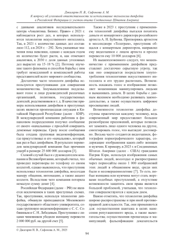 Статья: К вопросу об уголовной ответственности за использование технологии дипфейка в Российской Федерации (с учетом опыта Соединенных Штатов Америки) (2025)