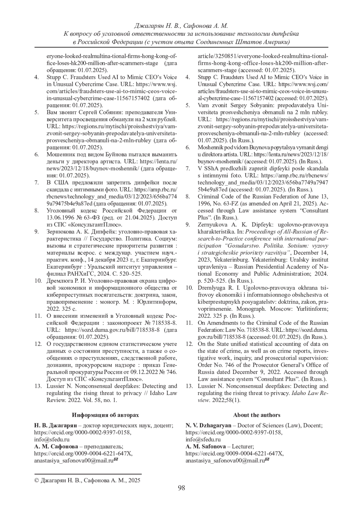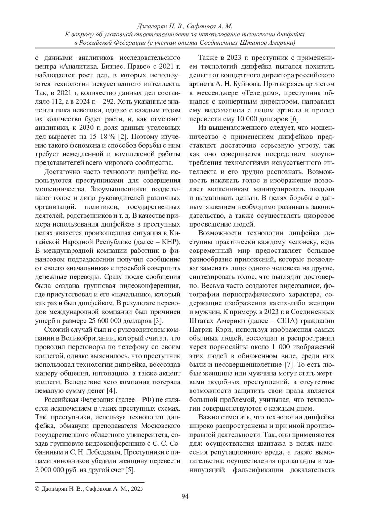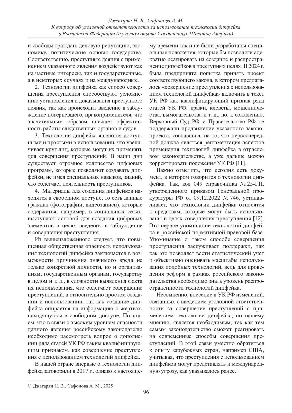 ДЖАГАРЯН Н. В., САФОНОВА А. М. К ВОПРОСУ ОБ УГОЛОВНОЙ ОТВЕТСТВЕННОСТИ ЗА ИСПОЛЬЗОВАНИЕ ТЕХНОЛОГИИ ДИПФЕЙКА В РОССИЙСКОЙ ФЕДЕРАЦИИ (С УЧЕТОМ ОПЫТА СОЕДИНЕННЫХ ШТАТОВ АМЕРИКИ) // ВЕСТНИК СУРГУТСКОГО ГОСУДАРСТВЕННОГО УНИВЕРСИТЕТА. 2025. ТОМ 13, № 1