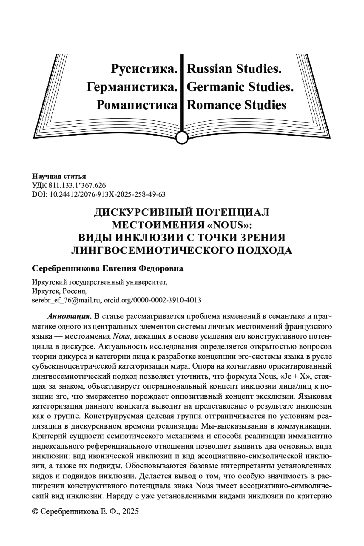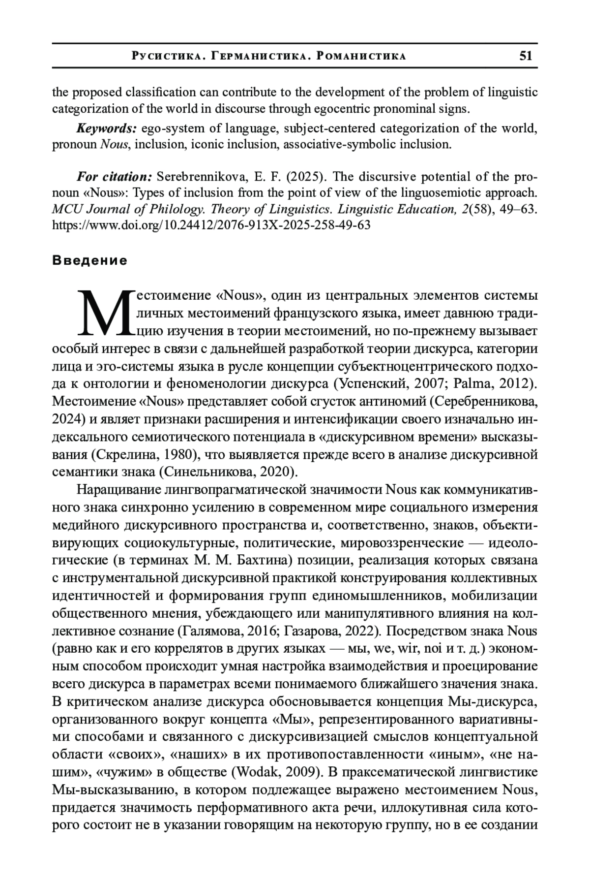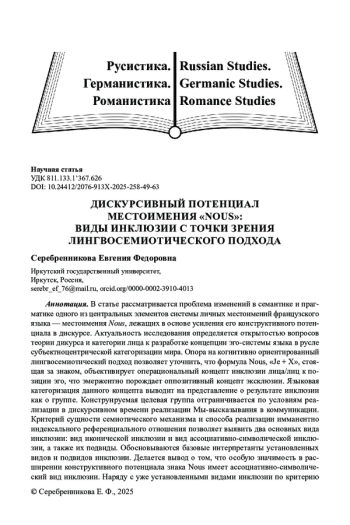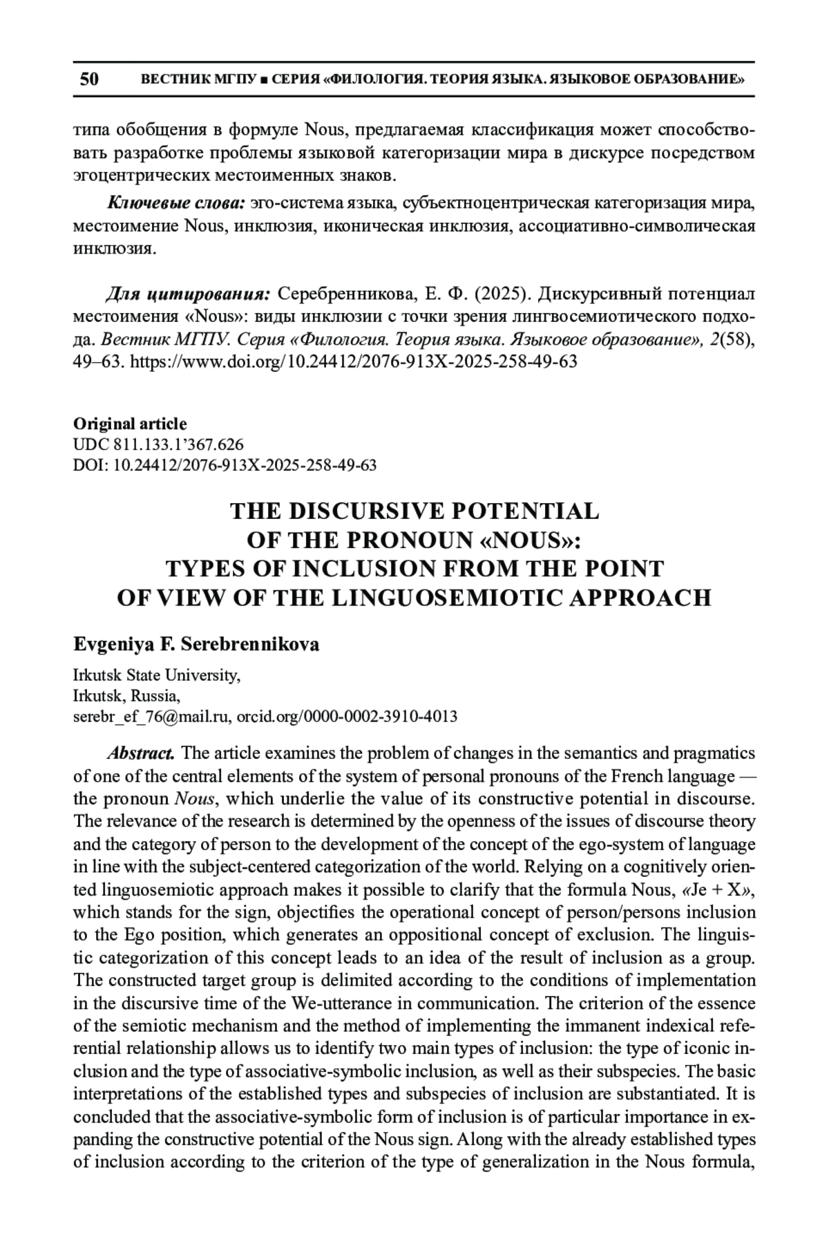В статье рассматривается проблема изменений в семантике и прагматике одного из центральных элементов системы личных местоимений французского языка - местоимения Nous, лежащих в основе усиления его конструктивного потенциала в дискурсе. Актуальность исследования определяется открытостью вопросов теории дикурса и категории лица к разработке концепции эго-системы языка в русле субъектноцентрической категоризации мира. Опора на когнитивно ориентированный лингвосемиотический подход позволяет уточнить, что формула Nous, «Je + Х», стоящая за знаком, объективирует операциональный концепт инклюзии лица/лиц к позиции эго, что эмержентно порождает оппозитивный концепт эксклюзии. Языковая категоризация данного концепта выводит на представление о результате инклюзии как о группе. Конструируемая целевая группа отграничивается по условиям реализации в дискурсивном времени реализации Мы-высказывания в коммуникации. Критерий сущности семиотического механизма и способа реализации имманентно индексального референциального отношения позволяет выявить два основных вида инклюзии: вид иконической инклюзии и вид ассоциативно-символической инклюзии, а также их подвиды. Обосновываются базовые интерпретанты установленных видов и подвидов инклюзии. Делается вывод о том, что особую значимость в расширении конструктивного потенциала знака Nous имеет ассоциативно-символический вид инклюзии. Наряду с уже установленными видами инклюзии по критерию типа обобщения в формуле Nous, предлагаемая классификация может способствовать разработке проблемы языковой категоризации мира в дискурсе посредством эгоцентрических местоименных знаков.