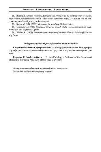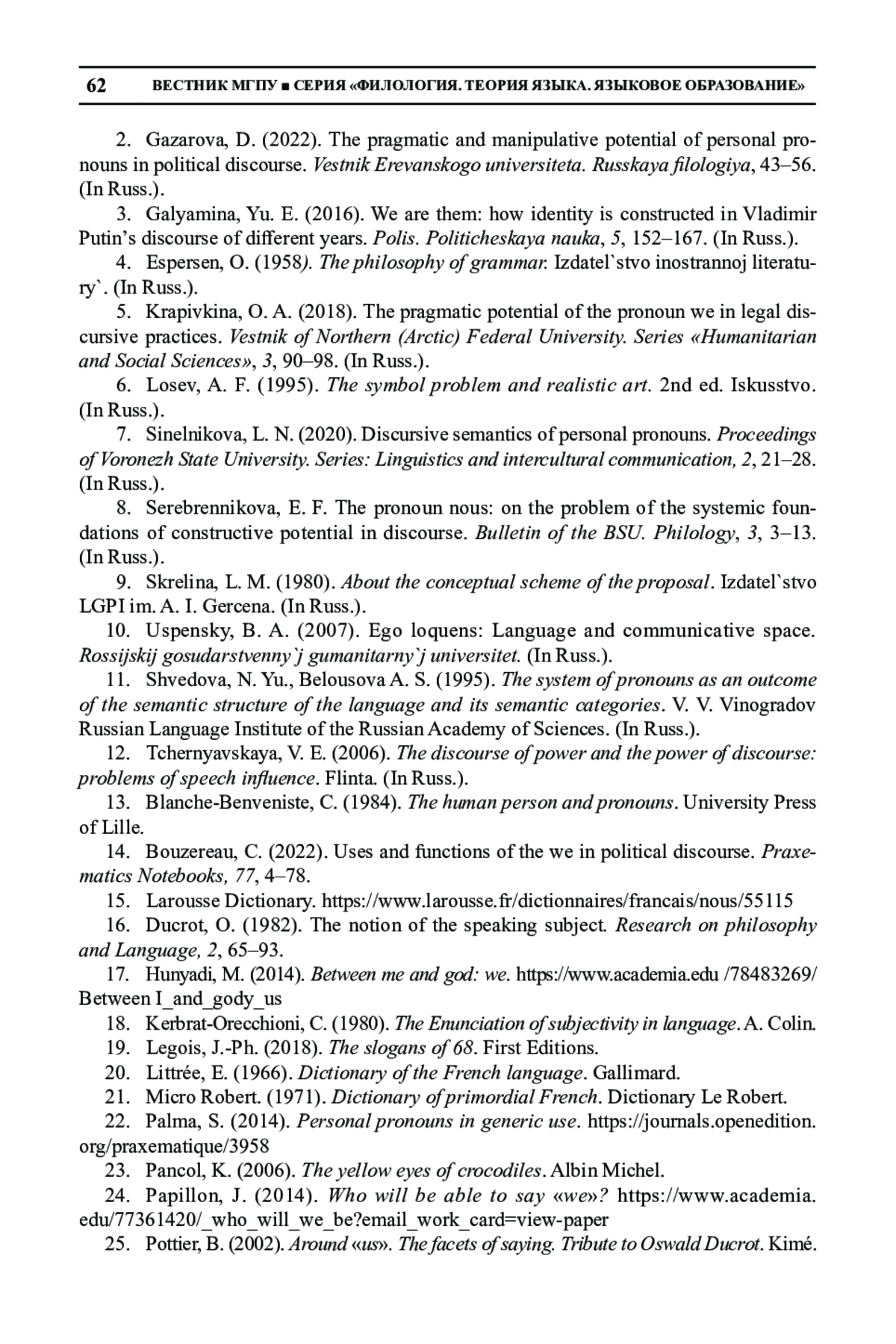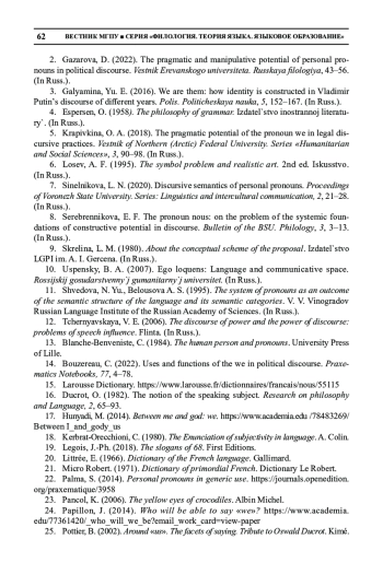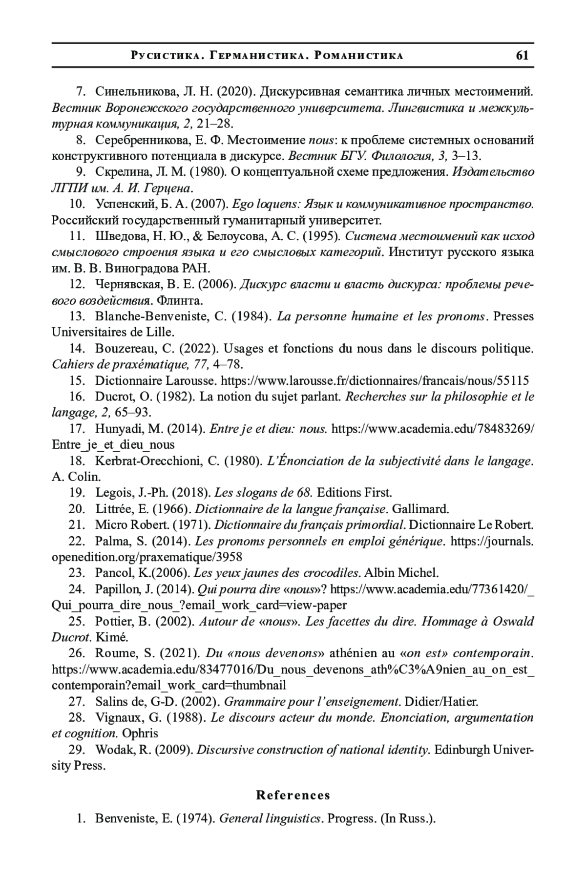В статье рассматривается проблема изменений в семантике и прагматике одного из центральных элементов системы личных местоимений французского языка - местоимения Nous, лежащих в основе усиления его конструктивного потенциала в дискурсе. Актуальность исследования определяется открытостью вопросов теории дикурса и категории лица к разработке концепции эго-системы языка в русле субъектноцентрической категоризации мира. Опора на когнитивно ориентированный лингвосемиотический подход позволяет уточнить, что формула Nous, «Je + Х», стоящая за знаком, объективирует операциональный концепт инклюзии лица/лиц к позиции эго, что эмержентно порождает оппозитивный концепт эксклюзии. Языковая категоризация данного концепта выводит на представление о результате инклюзии как о группе. Конструируемая целевая группа отграничивается по условиям реализации в дискурсивном времени реализации Мы-высказывания в коммуникации. Критерий сущности семиотического механизма и способа реализации имманентно индексального референциального отношения позволяет выявить два основных вида инклюзии: вид иконической инклюзии и вид ассоциативно-символической инклюзии, а также их подвиды. Обосновываются базовые интерпретанты установленных видов и подвидов инклюзии. Делается вывод о том, что особую значимость в расширении конструктивного потенциала знака Nous имеет ассоциативно-символический вид инклюзии. Наряду с уже установленными видами инклюзии по критерию типа обобщения в формуле Nous, предлагаемая классификация может способствовать разработке проблемы языковой категоризации мира в дискурсе посредством эгоцентрических местоименных знаков.