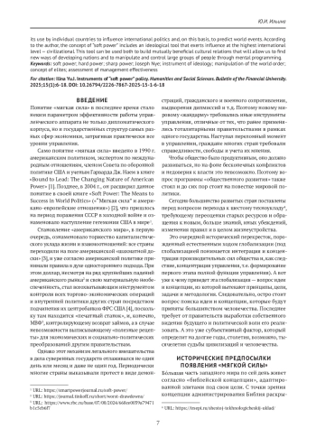 Цель статьи — ознакомление с понятием «мягкая сила», методиками его применения и ролью данного инструмента в решении задач мирового сообщества. Неясная и противоречивая формулировка понятия «мягкая сила» породила огромное количество мнений относительно содержания его целей, задач и инструментов. В настоящий момент, с опорой на культурную дипломатию, выстроено огромное количество рейтингов, лидерство в которых дает возможность каждой стране реализовать свои цели в международной политике. В 90-х гг. влиятельный политолог и государственный деятель США Д. Най в своей книге свободного жанра ввел довольно противоречивое понятие «мягкая сила», которое быстро распространилось в публицистике и научно-популярных статьях. Сейчас это предмет изучения науки. Многие страны соревнуются в применении этой самой «мягкой силы»: в мире работает более десятка крупных международных аналитических рейтинговых агентств. Поэтому вполне закономерно ознакомиться с тем, что вкладывает в термин «мягкая сила» его автор, и как понимают его остальные. В ходе исследования были использованы методы анализа, синтеза, аналогии и дедукции. Изучение работ Ная, его предшественников и современных авторов, развивающих его идеи, показало, что «мягкая сила» — мощный инструмент влияния на массовое «мировоззрение», его могут применять правящие круги высшего уровня для продвижения своей повестки, результат же будет зависеть от их изначальных целей. «Мягкая сила» — это набор разнообразных параметров рейтингов, свое образная ревизия материальных и нематериальных ресурсов, позволяющая судить о возможности ее применения для влияния в международной политике теми или иными странами и, исходя из этого, прогнозировать мировые события. По мнению автора, понятие «мягкая сила» включает в себя идеологический инструмент, оказывающий влияние на самом высоком международном уровне — ц ивилизационном. Этот инструмент можно применить как для выстраивания взаимовыгодных культурных связей, которые позволят найти новые пути развития народов, так и использовать для манипуляции и тотального контроля путем ментального программирования огромных масс населения.