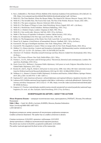 6. Наумов А. О., Белоусова М. В. Эволюция концепции «мягкой силы» Дж. Ная: от рождения идеи до наших дней. Вестник Московского университета. Серия 21. Управление (государство и общество). 2022;(2):3-23. URL: https://www.elibrary.ru/itppng