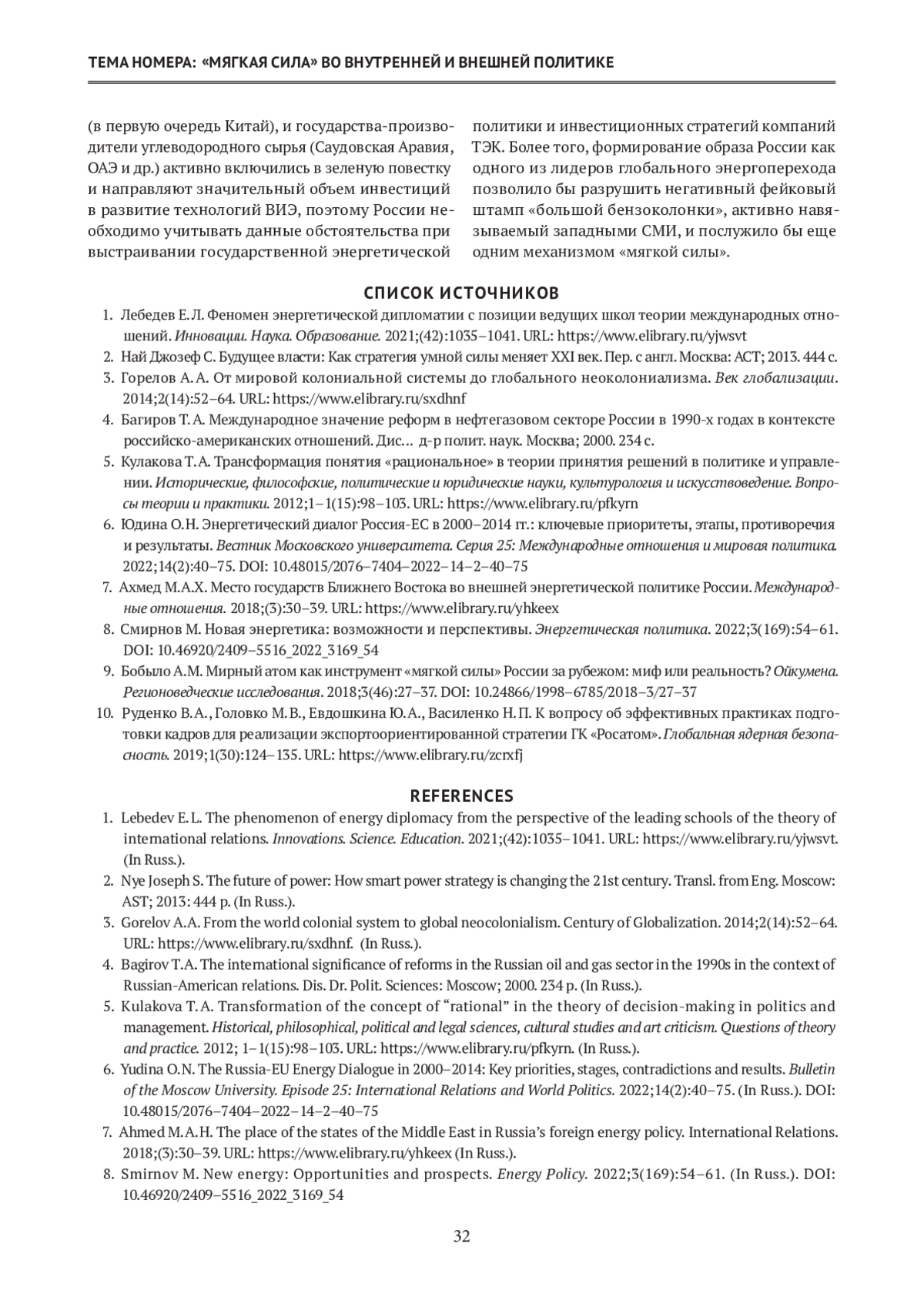 1. Лебедев Е. Л. Феномен энергетической дипломатии с позиции ведущих школ теории международных отношений. Инновации. Наука. Образование. 2021;(42):1035-1041. URL: https://www.elibrary.ru/yjwsvt
