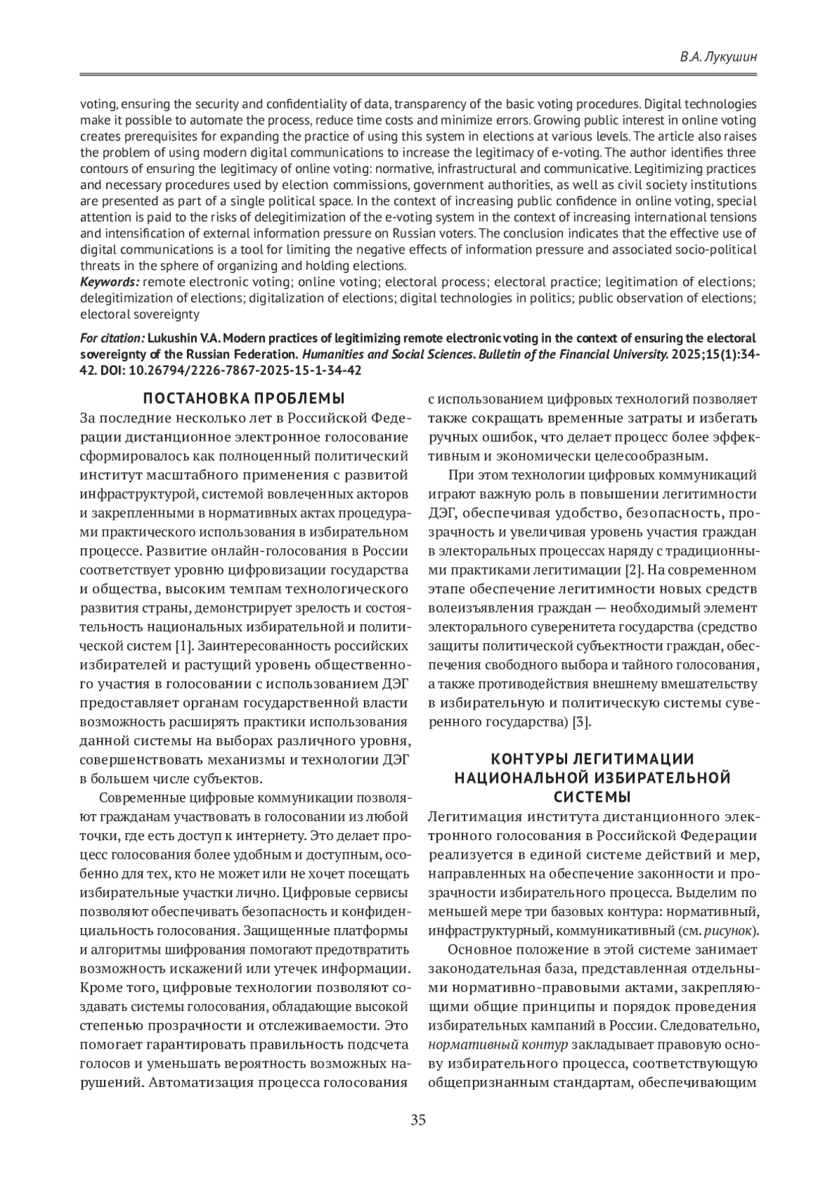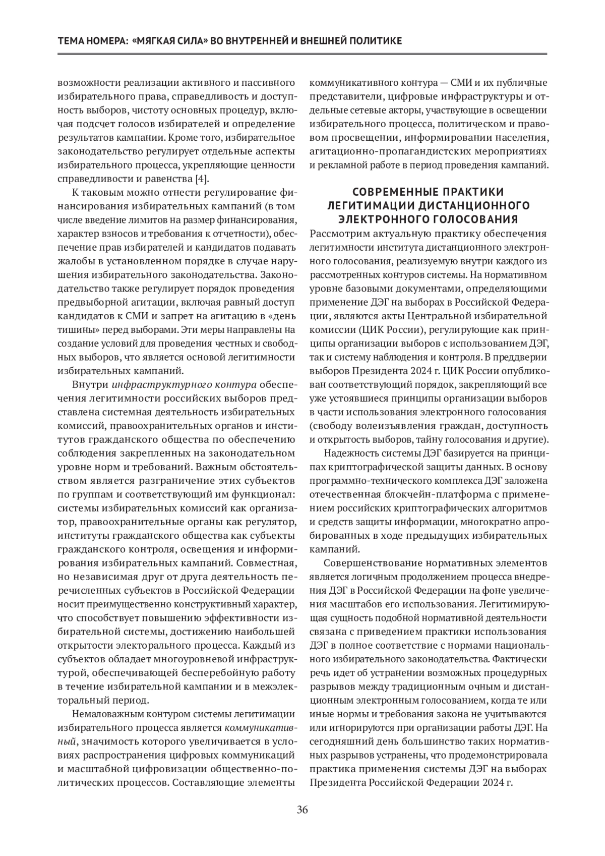 В статье рассматриваются современные практики легитимации института дистанционного электронного голосования (ДЭГ), реализуемые в последние годы в Российской Федерации с использованием цифровых и нецифровых технологий в контексте обеспечения электорального суверенитета страны. Автор анализирует развитие онлайн-голосования в контексте комплексной цифровизации государства и общества, подчеркивая его соответствие уровню технологического развития страны. Особое внимание уделяется преимуществам ДЭГ: удобству и доступности голосования через интернет, обеспечению безопасности и конфиденциальности данных, прозрачности основных процедур голосования. Цифровые технологии позволяют автоматизировать процесс, сократить временные затраты и минимизировать ошибки. Растущий общественный интерес к онлайн-голосованию создает предпосылки для расширения практики использования ДЭГ на выборах различного уровня. В статье также поднимается проблема использования современных цифровых коммуникаций в повышении легитимности ДЭГ. Автором выделяются три контура обеспечения легитимности онлайн-голосования: нормативный, инфраструктурный и коммуникативный. Легитимизирующие практики и соответствующие меры, используемые избирательными комиссиями, органами государственной власти, а также институтами гражданского общества представляются частью единого политического пространства. Особое внимание в контексте повышения доверия населения к онлайн-голосованию уделяется рискам делегитимации системы ДЭГ в условиях усиления международной напряженности и интенсификации внешнего информационного давления на российских избирателей. В заключении указывается, что эффективное применение цифровых коммуникаций является инструментом лимитирования негативных эффектов информационного давления и сопутствующих общественно-политических угроз в сфере организации и проведения выборов.