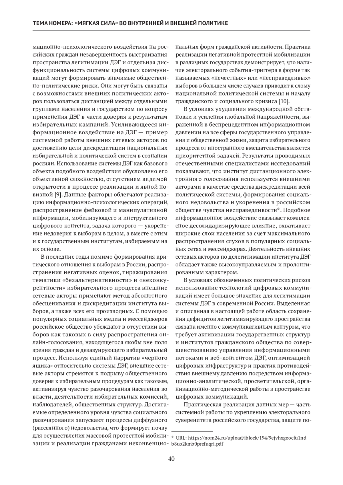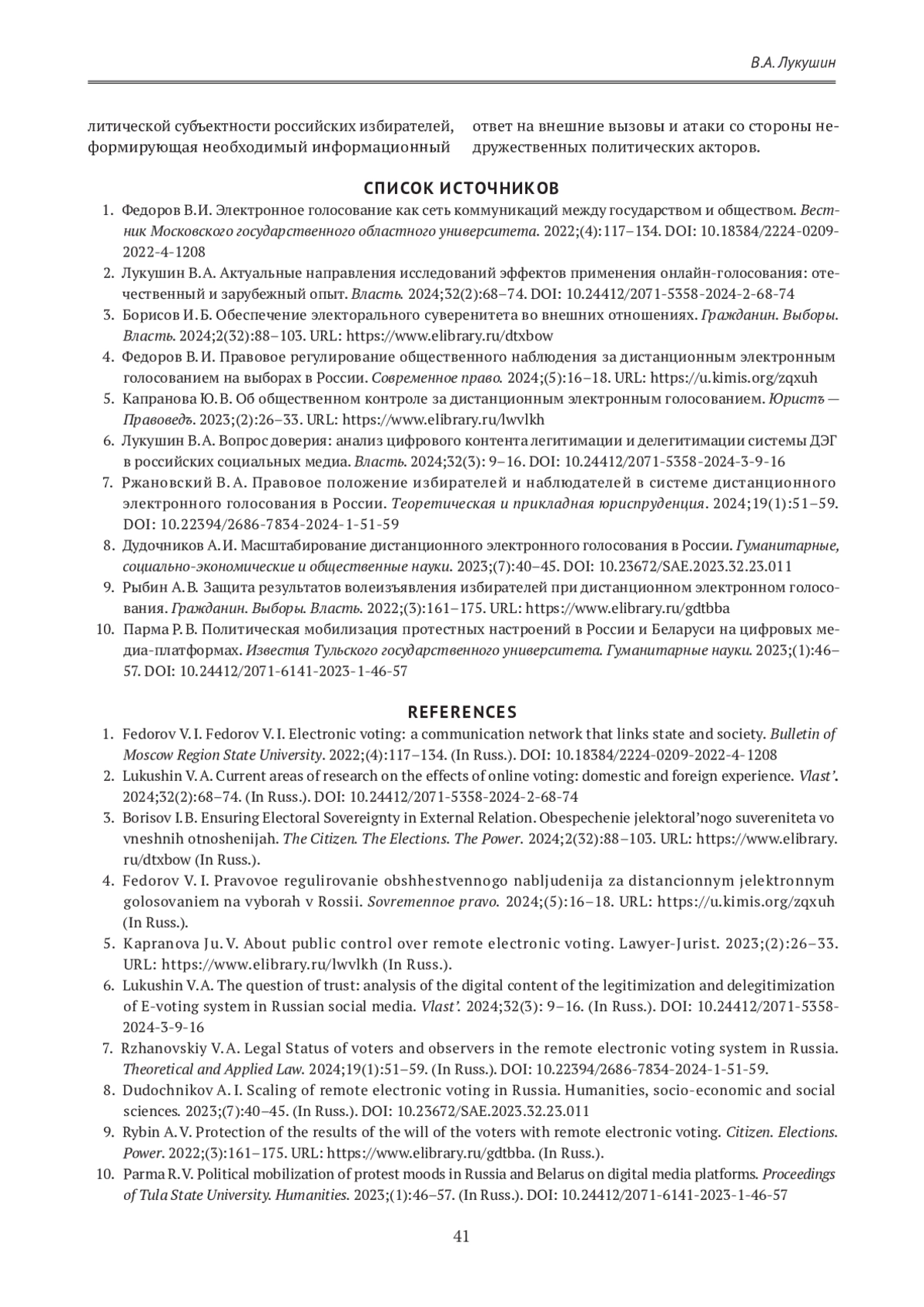 6. Лукушин В. А. Вопрос доверия: анализ цифрового контента легитимации и делегитимации системы ДЭГ в российских социальных медиа. Власть. 2024;32(3): 9-16. https://doi.org/10.24412/2071-5358-2024-3-9-16