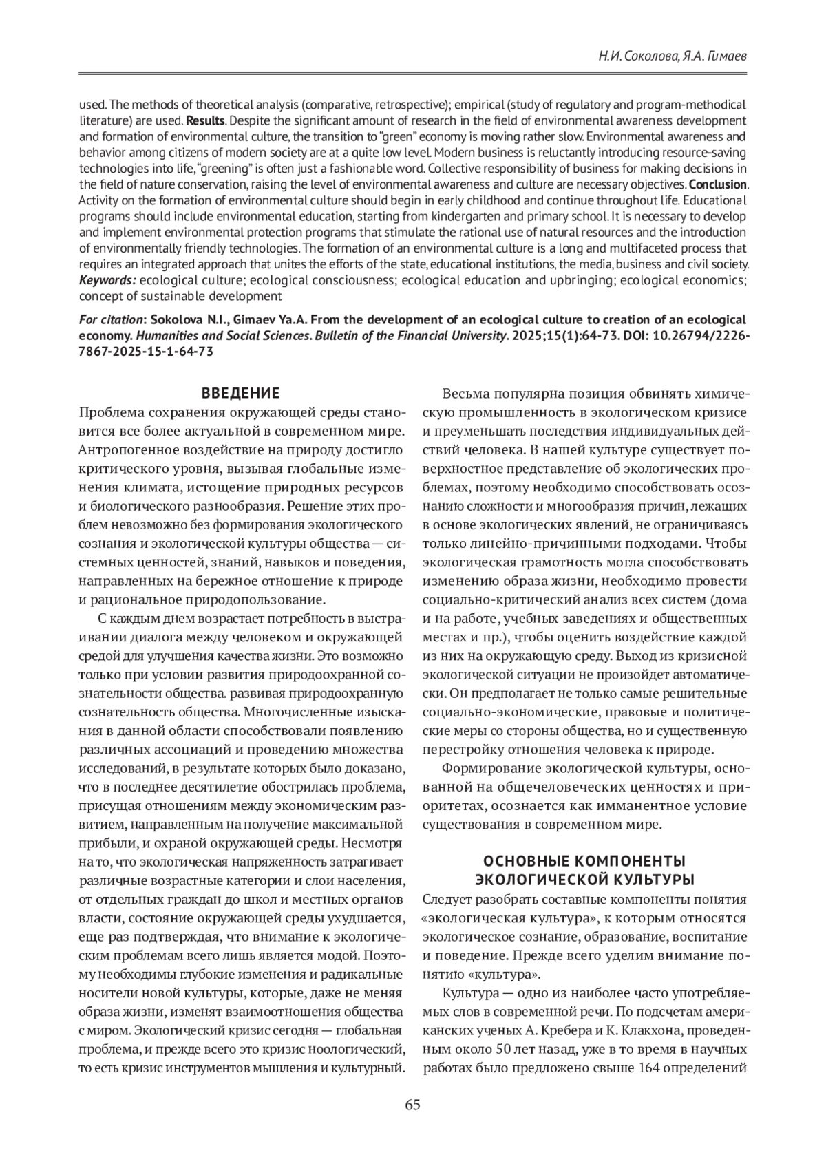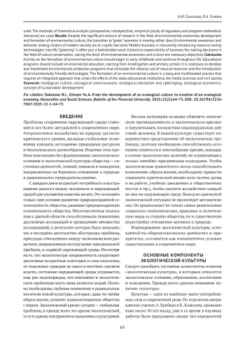Результаты. Несмотря на значительный объем исследований в области развития экологического сознания и формирования экологической культуры, переход экономики на зеленые рельсы экологии проходит достаточно медленно. Экологическое сознание и поведение граждан и общества в целом находятся на невысоком уровне. Бизнес медленно внедряет ресурсосберегающие технологии, а экологизация зачастую является лишь модным словом. Необходимы коллективная ответственность бизнеса за принятие решений в области охраны природы и повышение уровня экологического сознания и культуры.