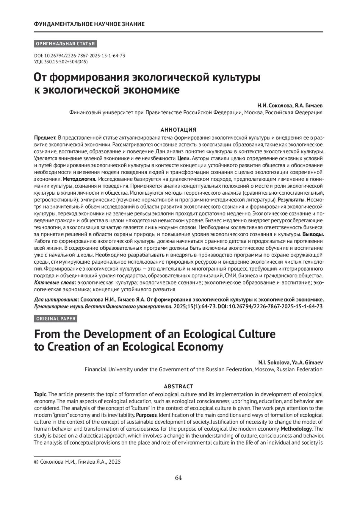 Цели. Авторы ставили целью определение основных условий и путей формирования экологической культуры в контексте концепции устойчивого развития общества и обоснование необходимости изменения модели поведения людей и трансформации сознания с целью экологизации современной экономики.