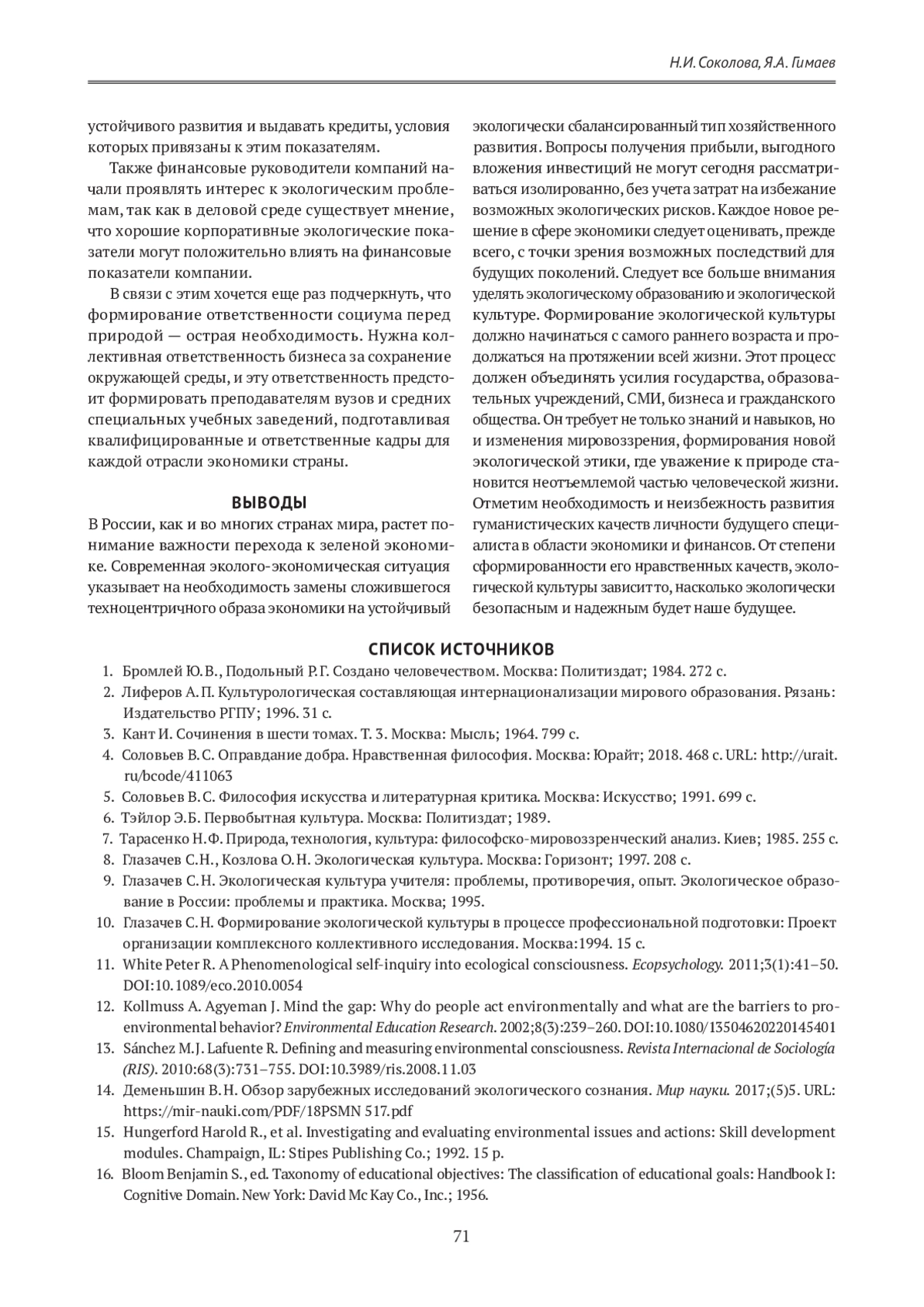 10. Глазачев С. Н. Формирование экологической культуры в процессе профессиональной подготовки: Проект организации комплексного коллективного исследования. Москва:1994. 15 с.