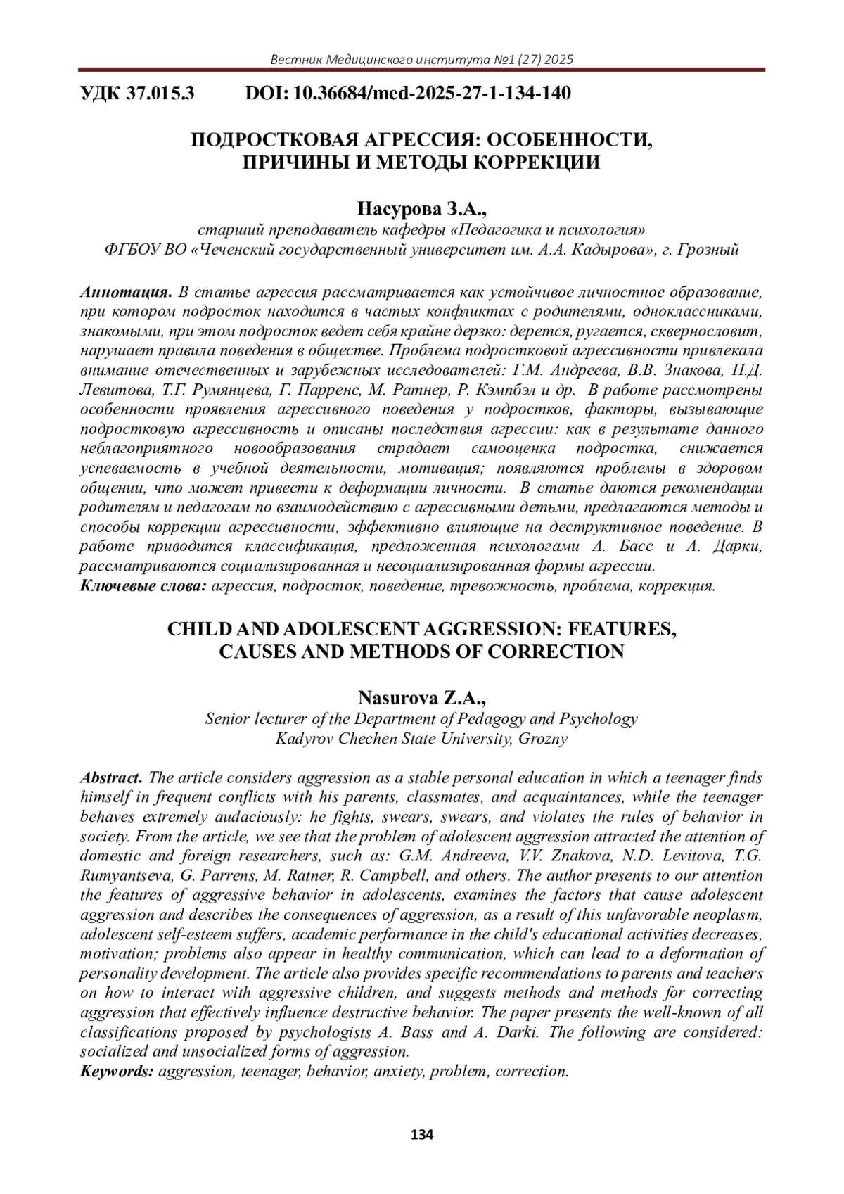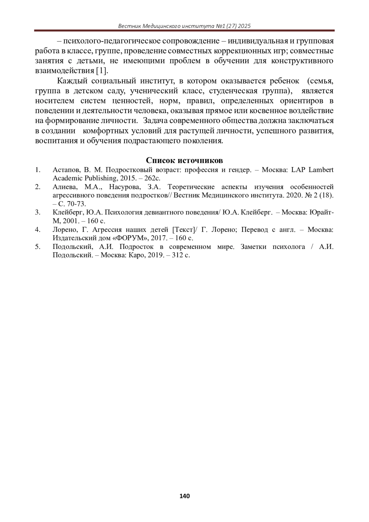 2. Алиева, М.А., Насурова, З.А. Теоретические аспекты изучения особенностей агрессивного поведения подростков// Вестник Медицинского института. 2020. № 2 (18). - С. 70-73. EDN: KFGYFT