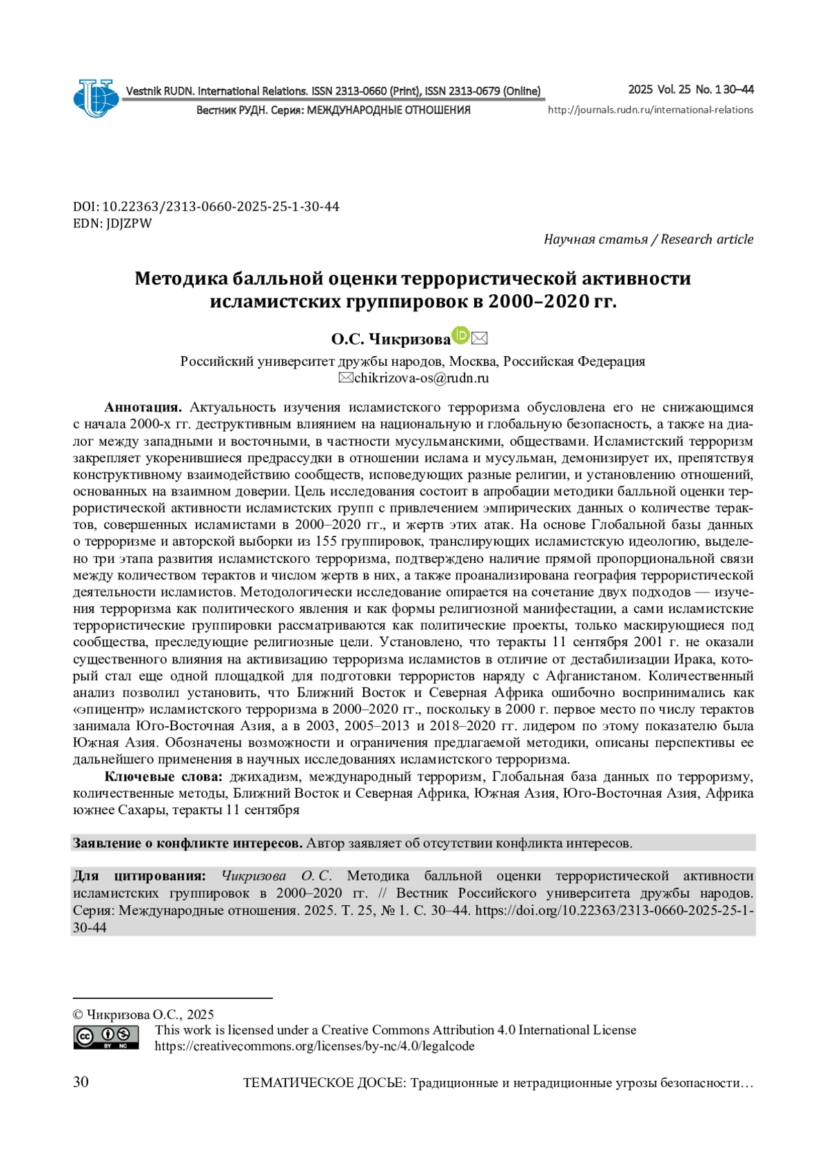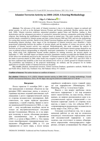 Цель исследования состоит в апробации методики балльной оценки террористической активности исламистских групп с привлечением эмпирических данных о количестве терактов, совершенных исламистами в 2000-2020 гг., и жертв этих атак. На основе Глобальной базы данных о терроризме и авторской выборки из 155 группировок, транслирующих исламистскую идеологию, выделено три этапа развития исламистского терроризма, подтверждено наличие прямой пропорциональной связи между количеством терактов и числом жертв в них, а также проанализирована география террористической деятельности исламистов. Методологически исследование опирается на сочетание двух подходов - изучения терроризма как политического явления и как формы религиозной манифестации, а сами исламистские террористические группировки рассматриваются как политические проекты, только маскирующиеся под сообщества, преследующие религиозные цели. Установлено, что теракты 11 сентября 2001 г. не оказали существенного влияния на активизацию терроризма исламистов в отличие от дестабилизации Ирака, который стал еще одной площадкой для подготовки террористов наряду с Афганистаном. Количественный анализ позволил установить, что Ближний Восток и Северная Африка ошибочно воспринимались как «эпицентр» исламистского терроризма в 2000-2020 гг., поскольку в 2000 г. первое место по числу терактов занимала Юго-Восточная Азия, а в 2003, 2005-2013 и 2018-2020 гг. лидером по этому показателю была Южная Азия. Обозначены возможности и ограничения предлагаемой методики, описаны перспективы ее дальнейшего применения в научных исследованиях исламистского терроризма.