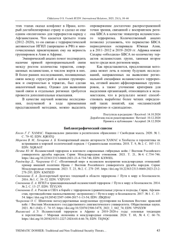 3. Почта Ю. М. Исламистский терроризм в контексте современных гибридных войн // Вестник Российского университета дружбы народов. Серия: Международные отношения. 2021. Т. 21, № 4. С.734-746. ;. DOI: 10.22363/2313-0660-2021-21-4-734-746 EDN: KXWIEL