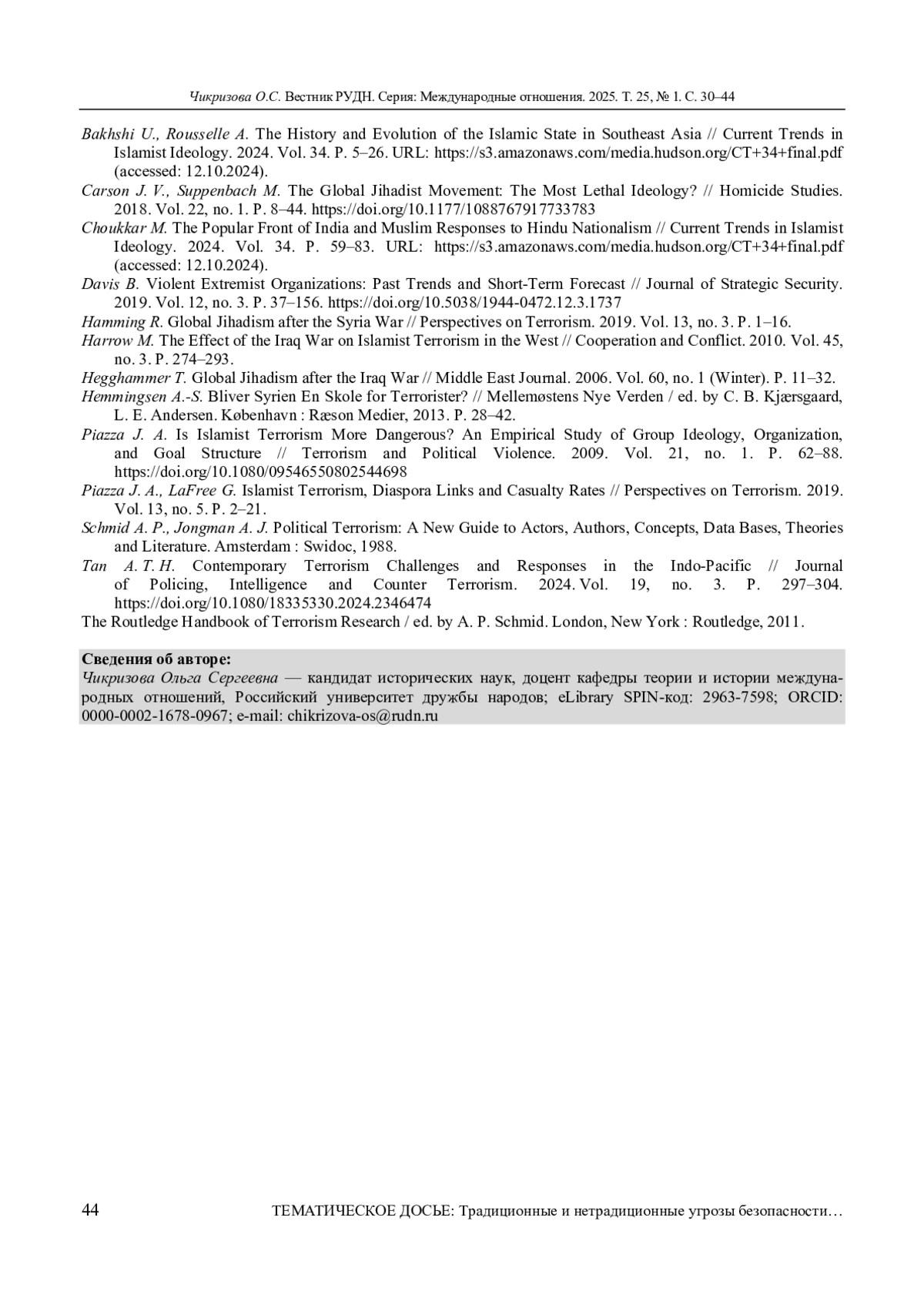 10. Bakhshi U., Rousselle A. The History and Evolution of the Islamic State in Southeast Asia // Current Trends in Islamist Ideology. 2024. Vol. 34. P. 5-26. URL: https://s3.amazonaws.com/media.hudson.org/CT+34+final.pdf (accessed: 12.10.2024).