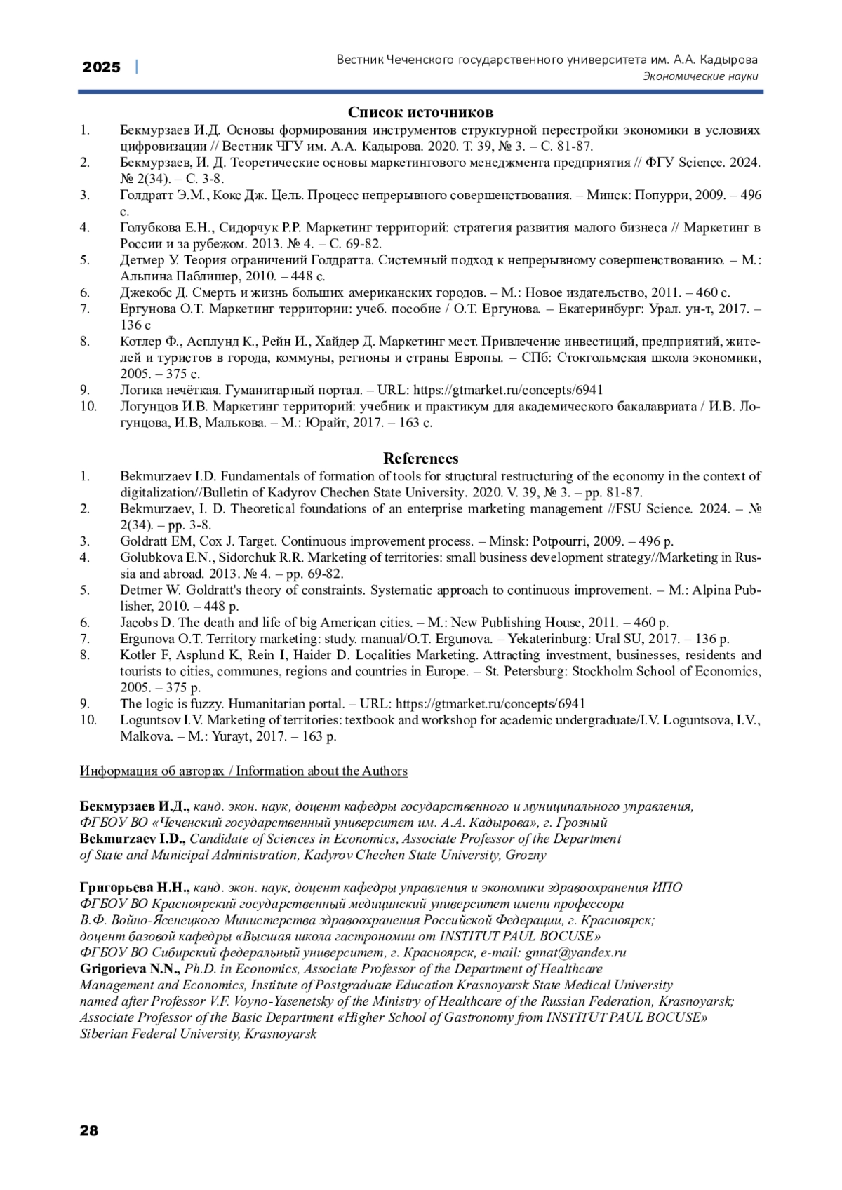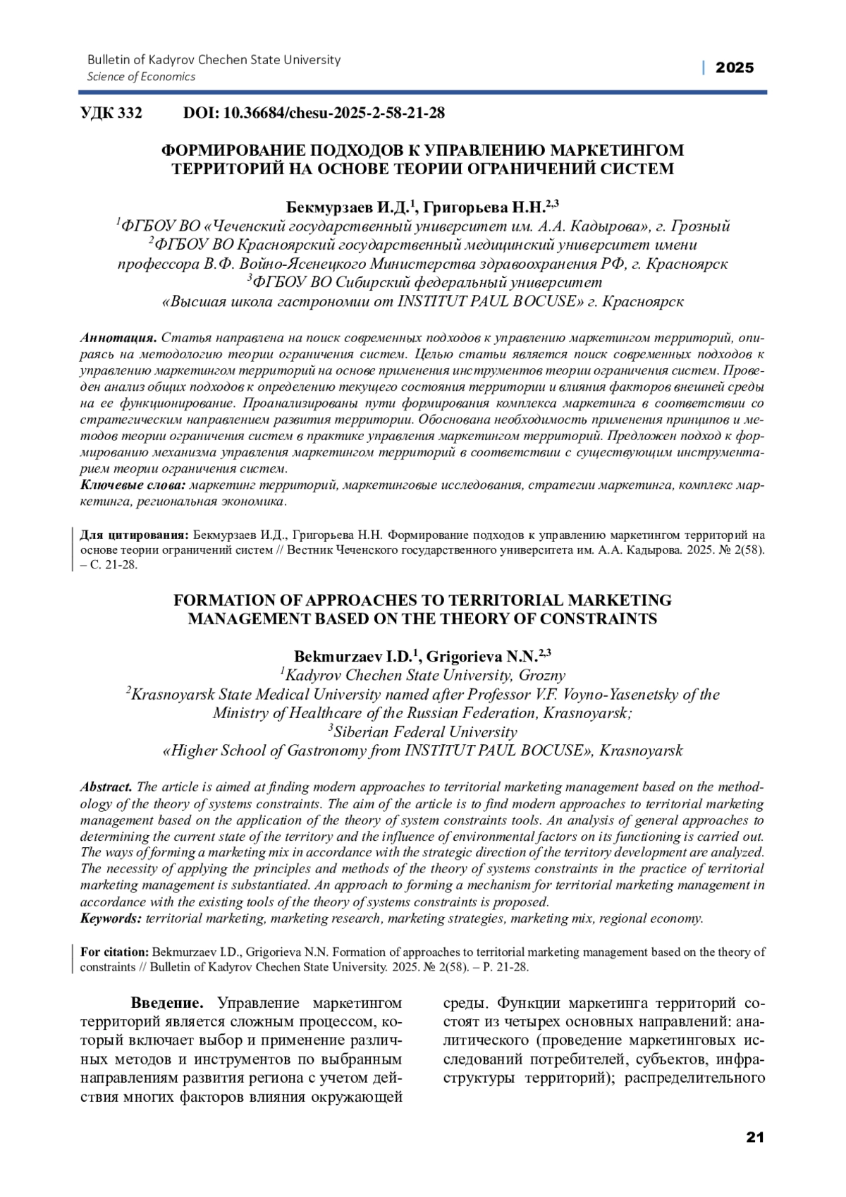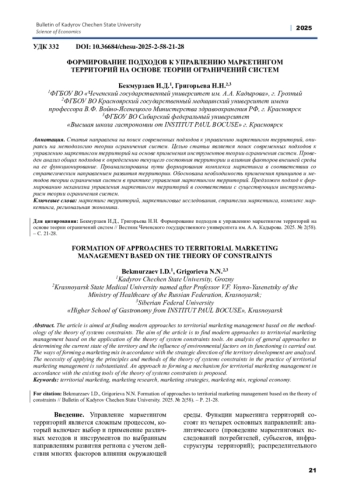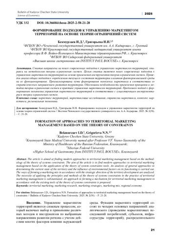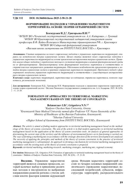 ГРИГОРЬЕВА Н.Н., БЕКМУРЗАЕВ И.Д. ФОРМИРОВАНИЕ ПОДХОДОВ К УПРАВЛЕНИЮ МАРКЕТИНГОМ ТЕРРИТОРИЙ НА ОСНОВЕ ТЕОРИИ ОГРАНИЧЕНИЙ СИСТЕМ // ВЕСТНИК ЧЕЧЕНСКОГО ГОСУДАРСТВЕННОГО УНИВЕРСИТЕТА ИМ. А. А. КАДЫРОВА. 2025. № 2 (58)