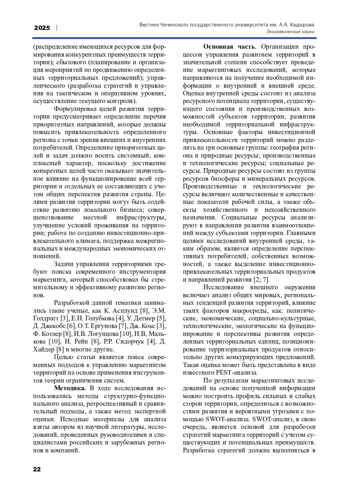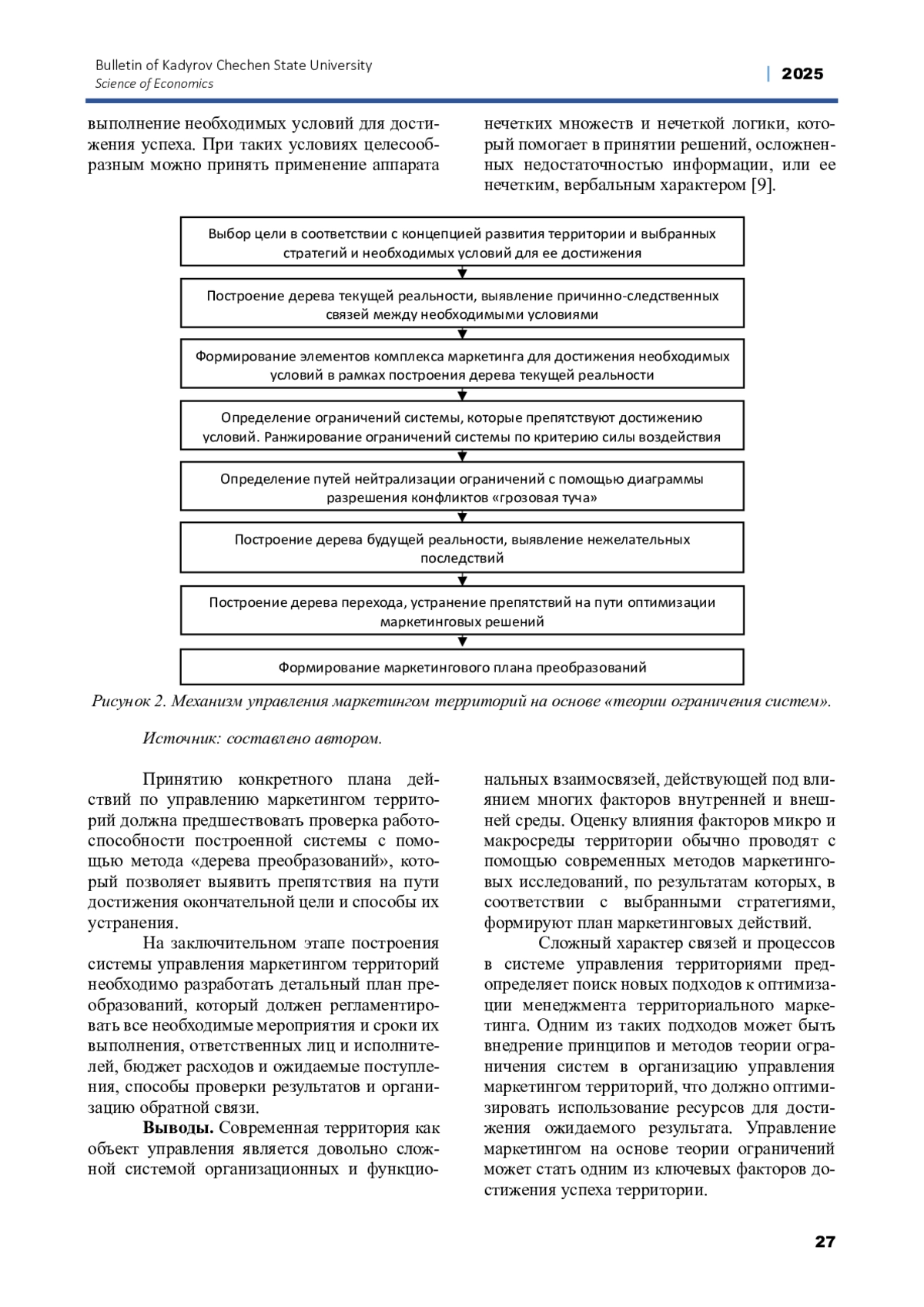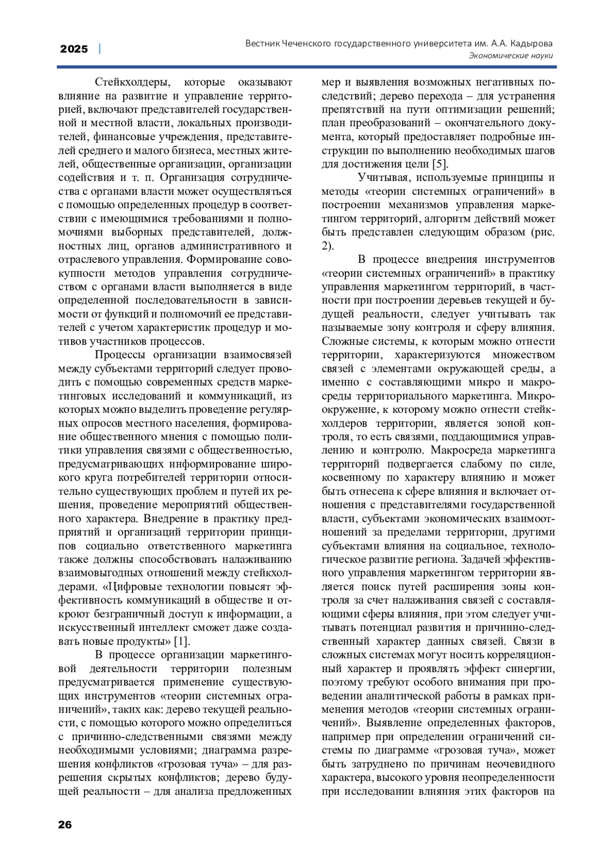 ГРИГОРЬЕВА Н.Н., БЕКМУРЗАЕВ И.Д. ФОРМИРОВАНИЕ ПОДХОДОВ К УПРАВЛЕНИЮ МАРКЕТИНГОМ ТЕРРИТОРИЙ НА ОСНОВЕ ТЕОРИИ ОГРАНИЧЕНИЙ СИСТЕМ // ВЕСТНИК ЧЕЧЕНСКОГО ГОСУДАРСТВЕННОГО УНИВЕРСИТЕТА ИМ. А. А. КАДЫРОВА. 2025. № 2 (58)