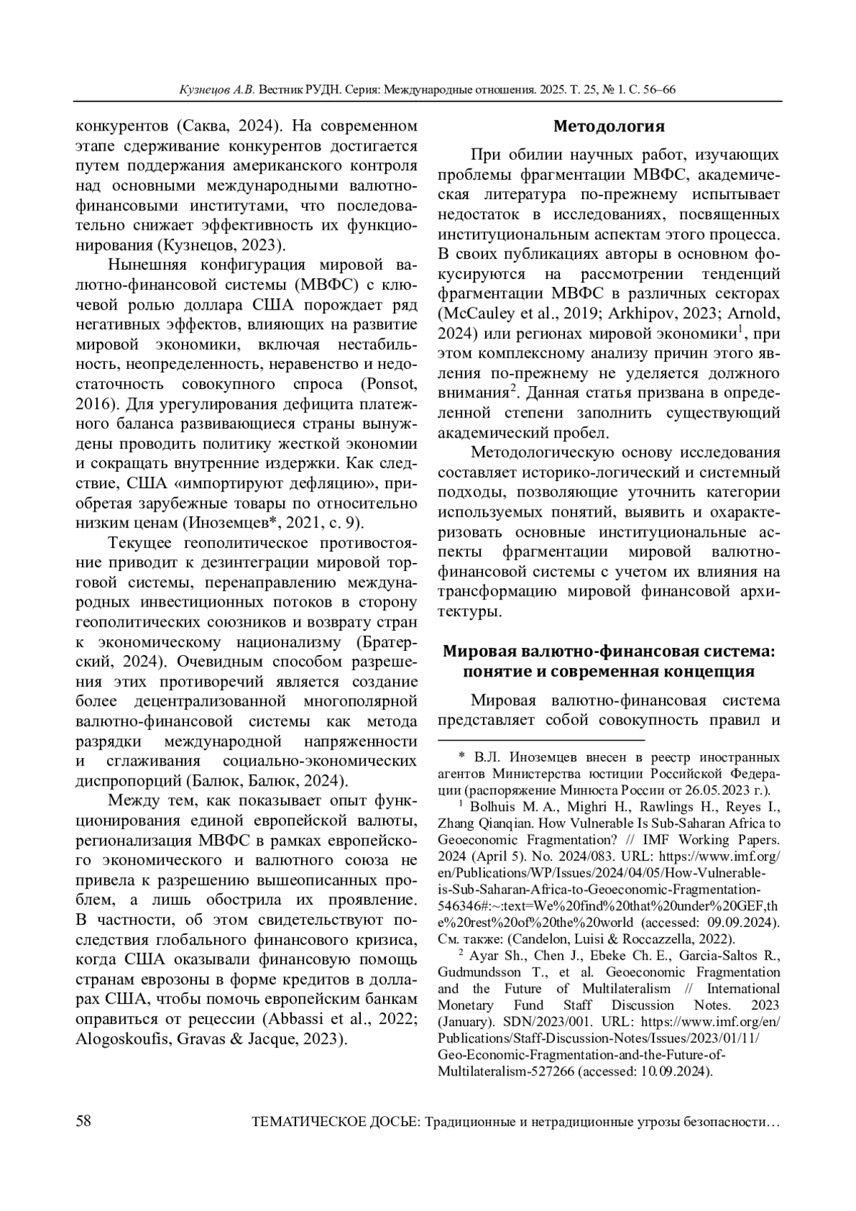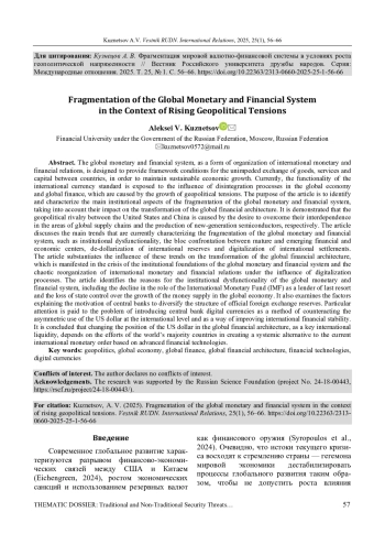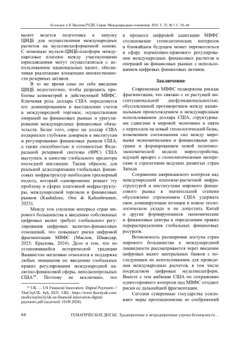 6. Кравченко Ю. Б. Фрагментационные процессы и позиции доллара США в мировой валютно-финансовой системе // Международная экономика. 2024. № 4. С. 249-258. ;. DOI: 10.33920/vne-04-2404-02 EDN: AZKVVM