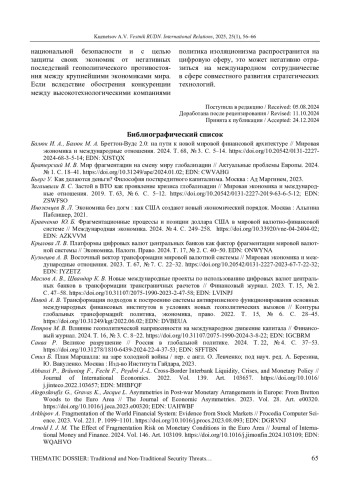1. Балюк И. А., Балюк М. А. Бреттон-Вудс 2.0: на пути к новой мировой финансовой архитектуре // Мировая экономика и международные отношения. 2024. Т. 68, № 3. С. 5-14. ;. DOI: 10.20542/0131-2227-2024-68-3-5-14 EDN: XJSTQX