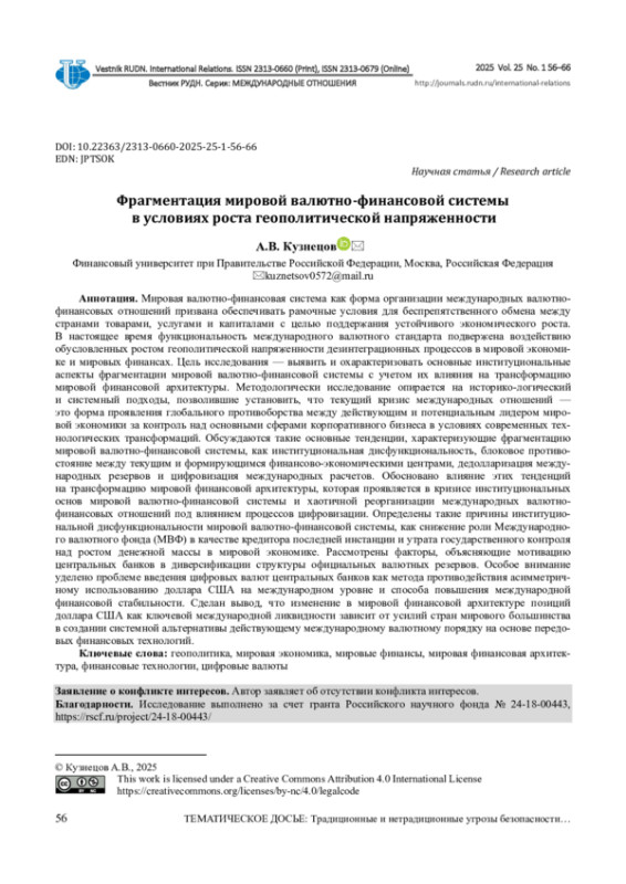 Цель исследования - выявить и охарактеризовать основные институциональные аспекты фрагментации мировой валютно-финансовой системы с учетом их влияния на трансформацию мировой финансовой архитектуры. Методологически исследование опирается на историко-логический и системный подходы, позволившие установить, что текущий кризис международных отношений - это форма проявления глобального противоборства между действующим и потенциальным лидером мировой экономики за контроль над основными сферами корпоративного бизнеса в условиях современных технологических трансформаций. Обсуждаются такие основные тенденции, характеризующие фрагментацию мировой валютно-финансовой системы, как институциональная дисфункциональность, блоковое противостояние между текущим и формирующимся финансово-экономическими центрами, дедолларизация международных резервов и цифровизация международных расчетов. Обосновано влияние этих тенденций на трансформацию мировой финансовой архитектуры, которая проявляется в кризисе институциональных основ мировой валютно-финансовой системы и хаотичной реорганизации международных валютно-финансовых отношений под влиянием процессов цифровизации. Определены такие причины институциональной дисфункциональности мировой валютно-финансовой системы, как снижение роли Международного валютного фонда (МВФ) в качестве кредитора последней инстанции и утрата государственного контроля над ростом денежной массы в мировой экономике. Рассмотрены факторы, объясняющие мотивацию центральных банков в диверсификации структуры официальных валютных резервов. Особое внимание уделено проблеме введения цифровых валют центральных банков как метода противодействия асимметричному использованию доллара США на международном уровне и способа повышения международной финансовой стабильности. Сделан вывод, что изменение в мировой финансовой архитектуре позиций доллара США как ключевой международной ликвидности зависит от усилий стран мирового большинства в создании системной альтернативы действующему международному валютному порядку на основе передовых финансовых технологий.