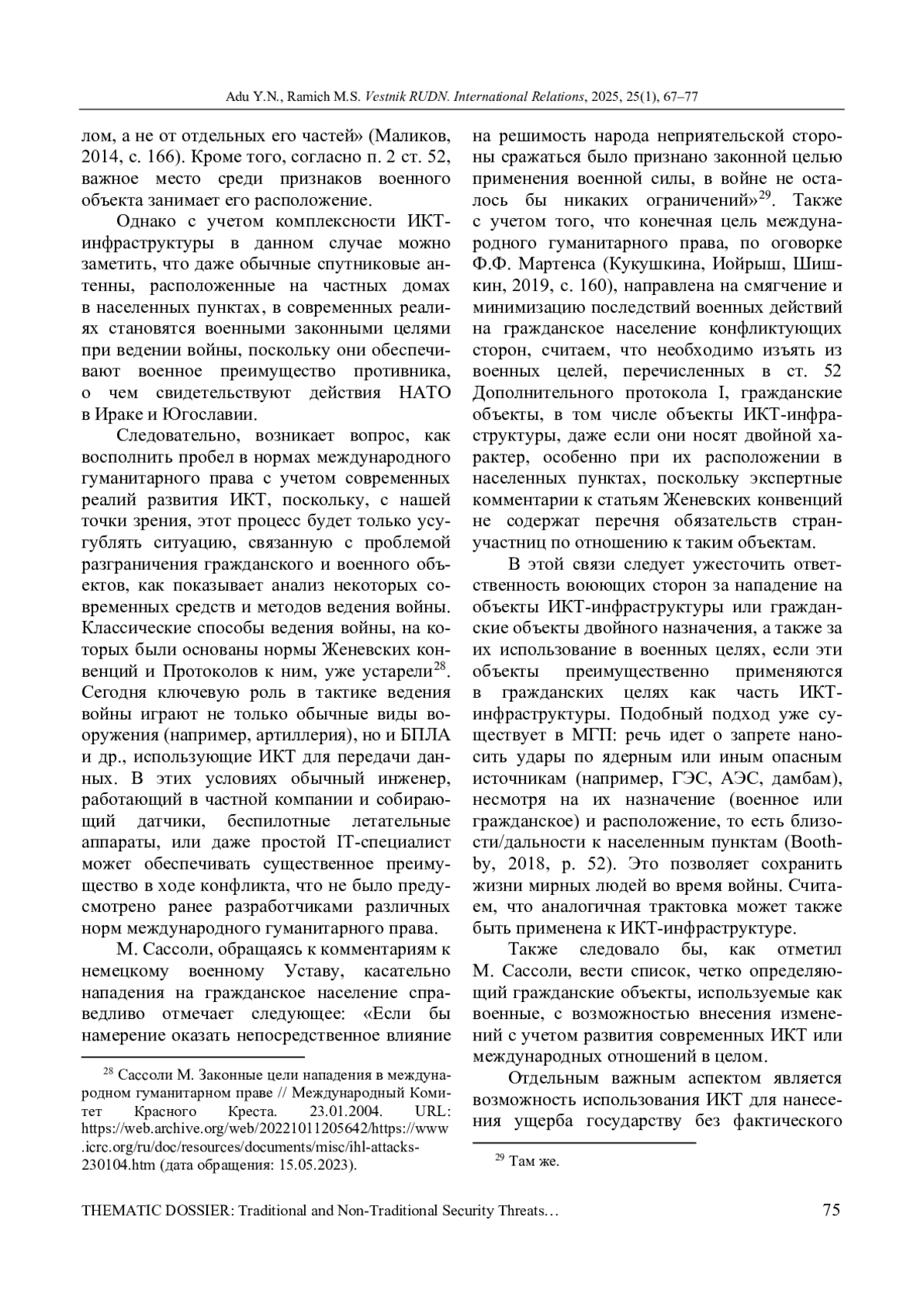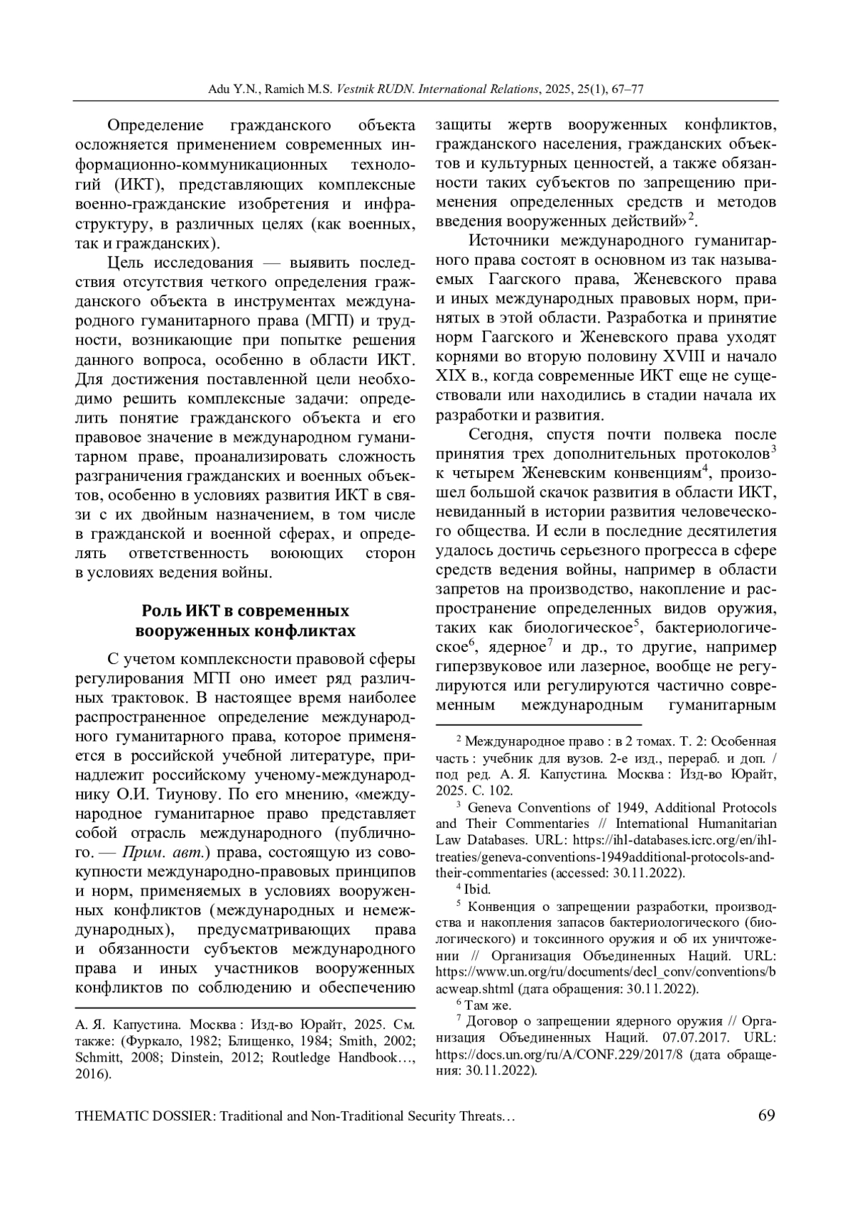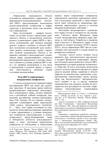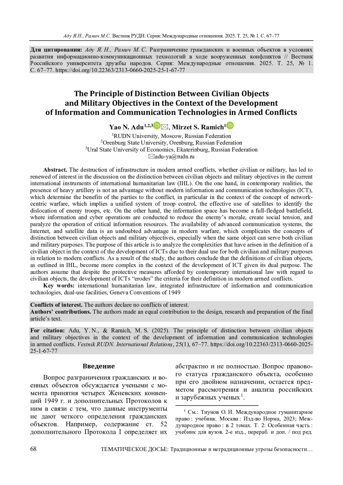 Цель исследования - проанализировать трудности, возникшие в определении гражданского объекта в контексте развития информационно-коммуникационных технологий в связи с их двойным использованием как в гражданских, так и в военных целях применительно к современным конфликтам. Авторы приходят к выводу, что определение гражданского объекта, как представляется в МГП, усложняется в условиях развития информационно-телекоммуникационных технологий ввиду своего двойного назначения. Несмотря на то, что современные положения международного права защищают гражданские объекты, развитие ИКТ «размывает» критерии их определения в условиях современных вооруженных конфликтов.