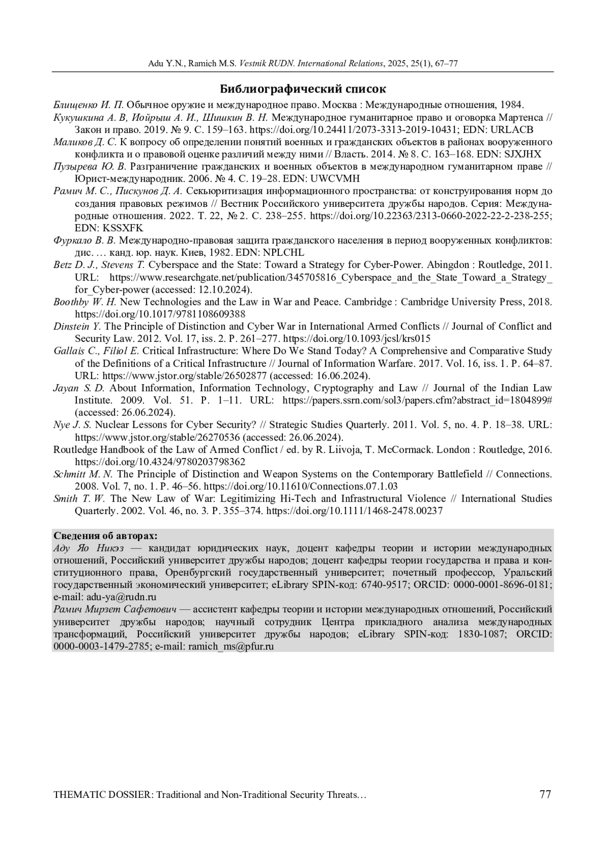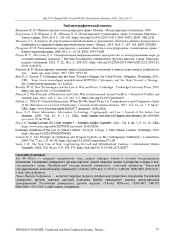 9. Dinstein Y. The Principle of Distinction and Cyber War in International Armed Conflicts // Journal of Conflict and Security Law. 2012. Vol. 17, iss. 2. P. 261-277. DOI: 10.1093/jcsl/krs015