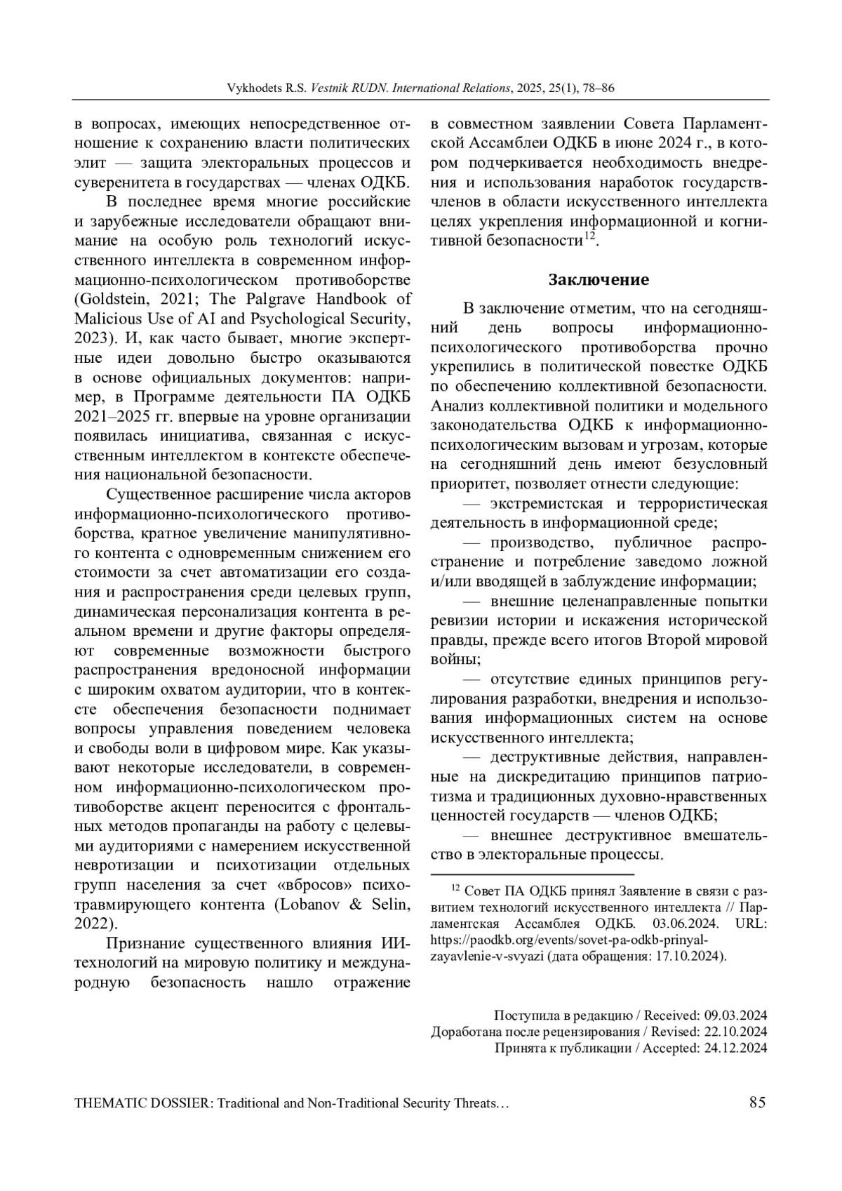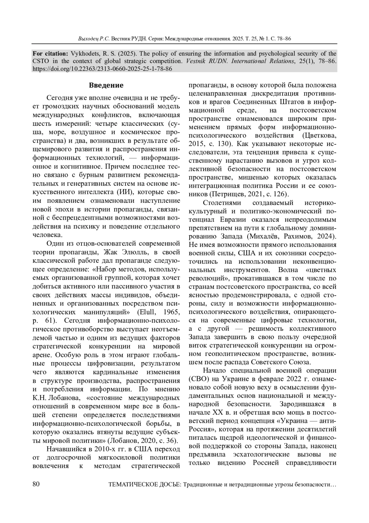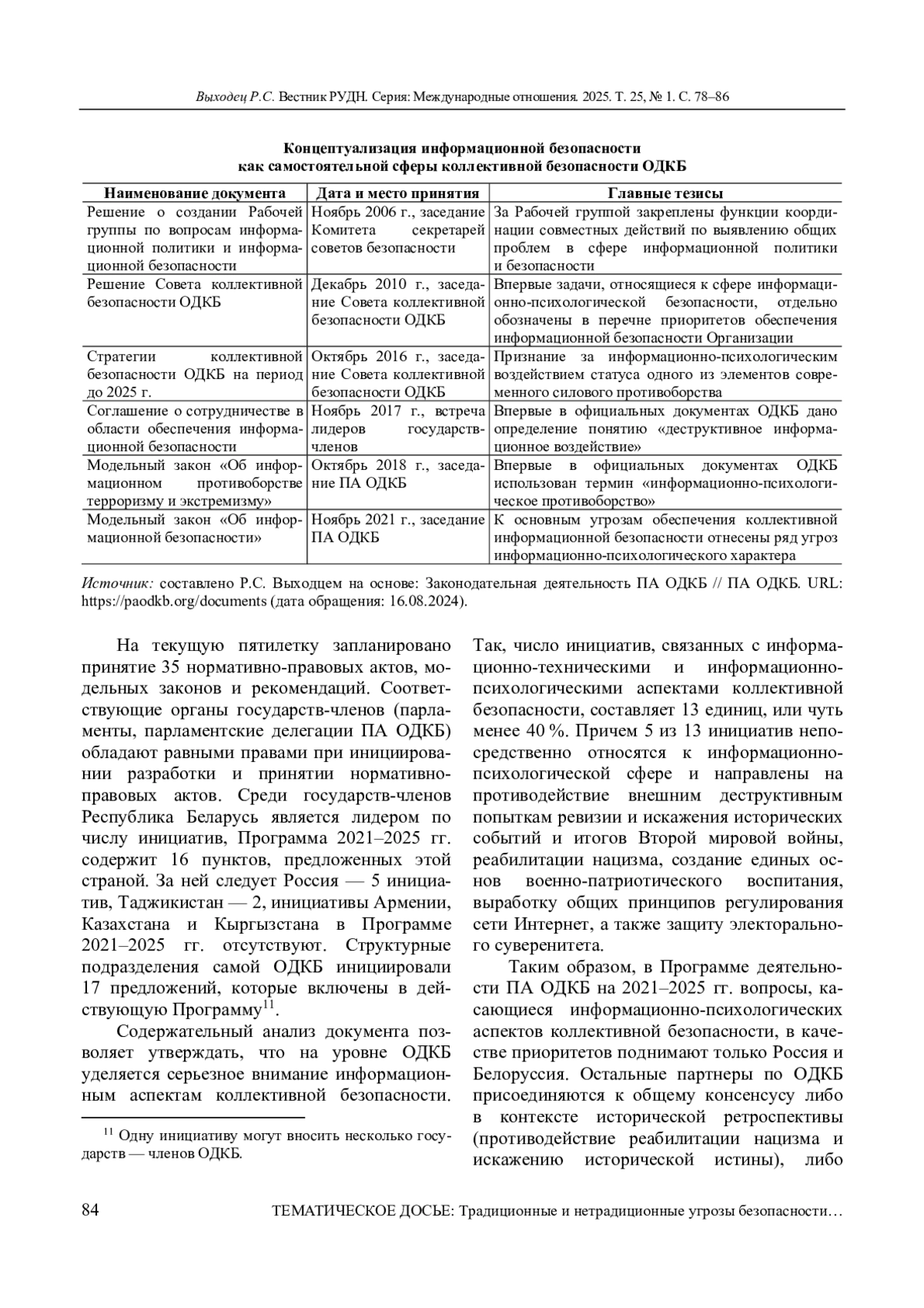 2. Выходец Р. С. Политика ОДКБ в сфере информационно-психологической безопасности. Санкт-Петербург: Фонд РМГК, 2024. EDN: CCDYLQ