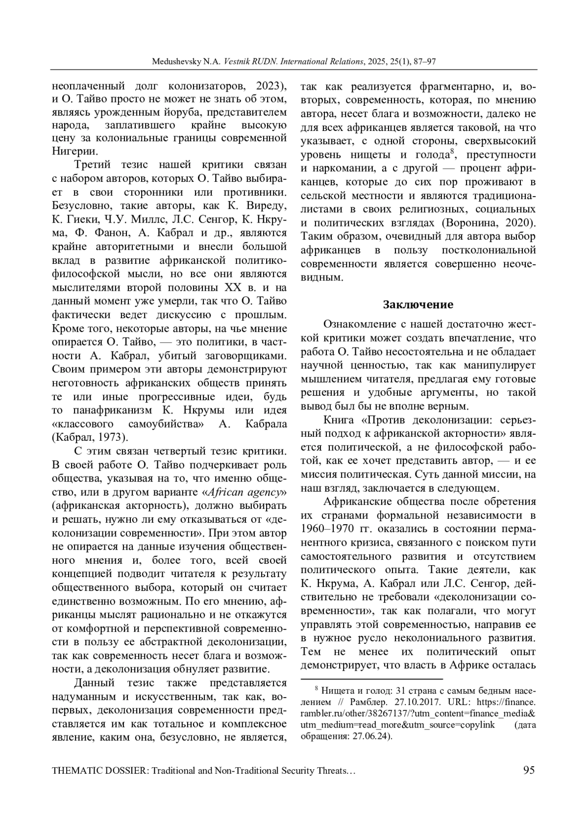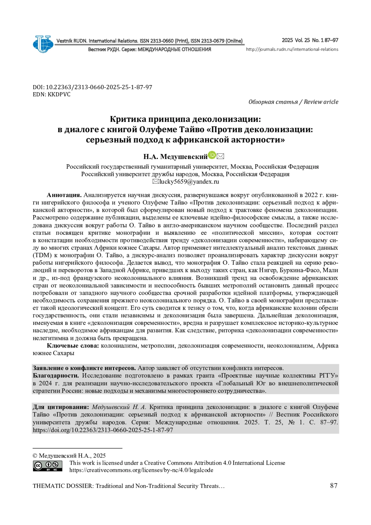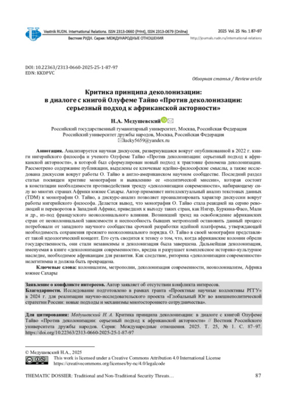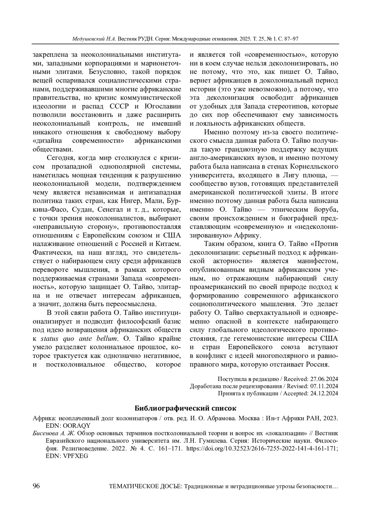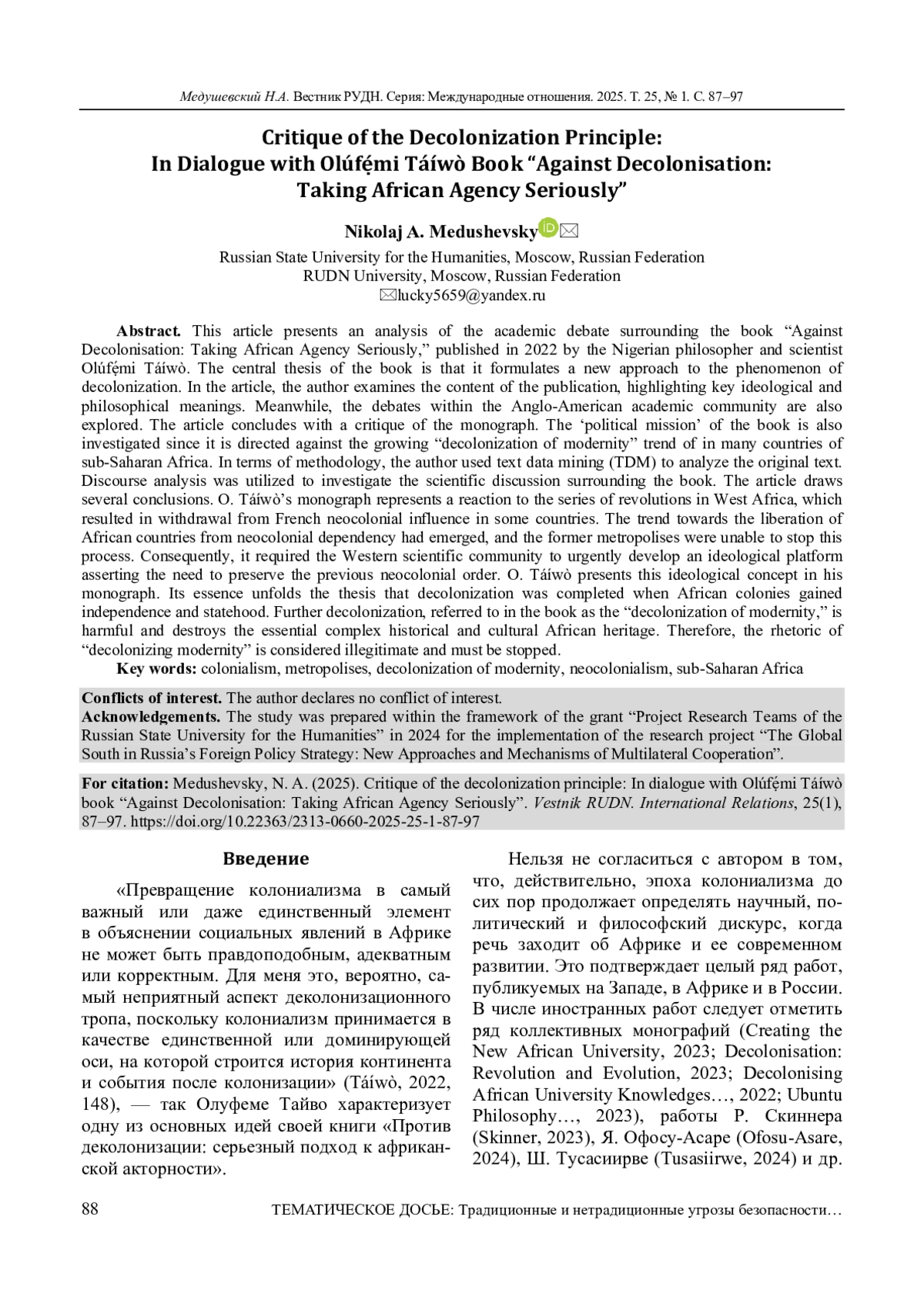 Анализируется научная дискуссия, развернувшаяся вокруг опубликованной в 2022 г. книги нигерийского философа и ученого Олуфеме Тайво «Против деколонизации: серьезный подход к африканской акторности», в которой был сформулирован новый подход к трактовке феномена деколонизации. Рассмотрено содержание публикации, выделены ее ключевые идейно-философские смыслы, а также исследована дискуссия вокруг работы О. Тайво в англо-американском научном сообществе. Последний раздел статьи посвящен критике монографии и выявлению ее «политической миссии», которая состоит в констатации необходимости противодействия тренду «деколонизации современности», набирающему силу во многих странах Африки южнее Сахары. Автор применяет интеллектуальный анализ текстовых данных (TDM) к монографии О. Тайво, а дискурс-анализ позволяет проанализировать характер дискуссии вокруг работы нигерийского философа. Делается вывод, что монография О. Тайво стала реакцией на серию революций и переворотов в Западной Африке, приведших к выходу таких стран, как Нигер, Буркина-Фасо, Мали и др., из-под французского неоколониального влияния. Возникший тренд на освобождение африканских стран от неоколониальной зависимости и неспособность бывших метрополий остановить данный процесс потребовали от западного научного сообщества срочной разработки идейной платформы, утверждающей необходимость сохранения прежнего неоколониального порядка. О. Тайво в своей монографии представляет такой идеологический концепт. Его суть сводится к тезису о том, что, когда африканские колонии обрели государственность, они стали независимы и деколонизация была завершена. Дальнейшая деколонизация, именуемая в книге «деколонизация современности», вредна и разрушает комплексное историко-культурное наследие, необходимое африканцам для развития. Как следствие, риторика «деколонизации современности» нелегитимна и должна быть прекращена.
