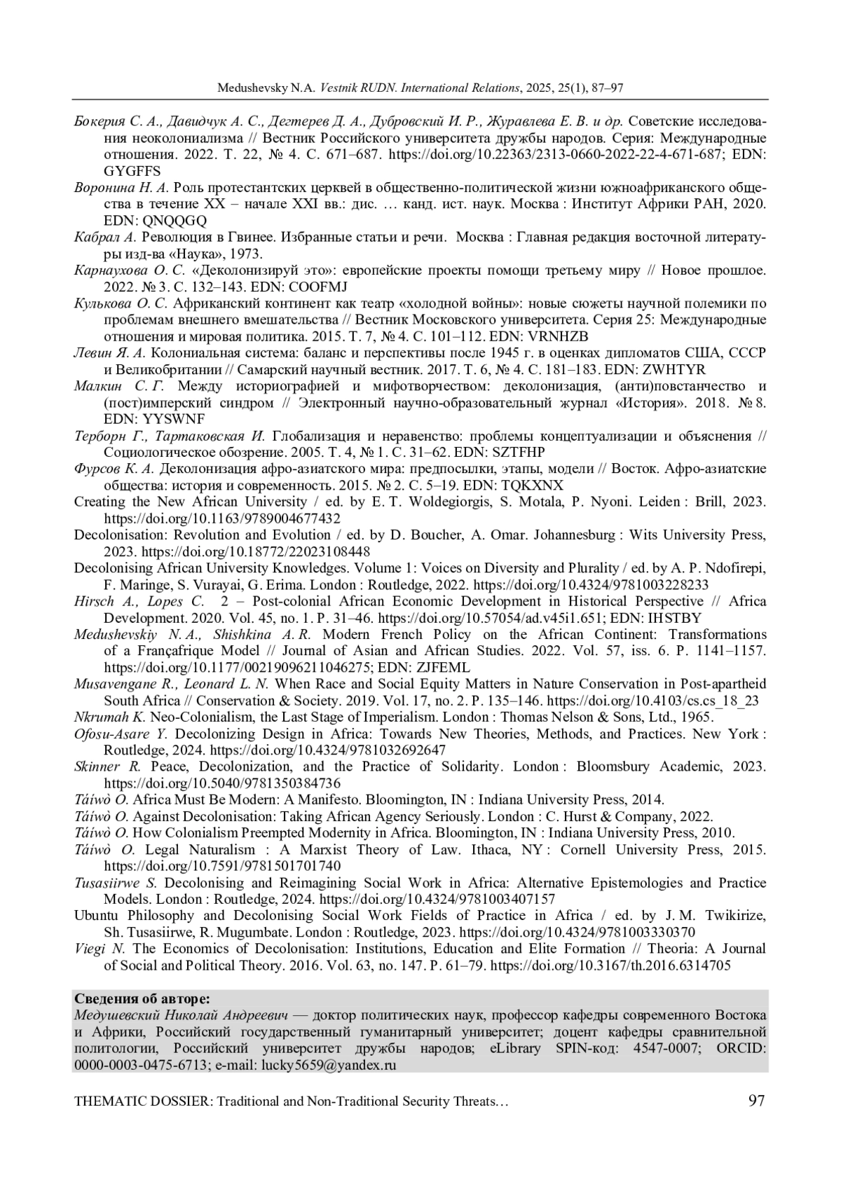 3. Бокерия С. А., Давидчук А. С., Дегтерев Д. А., Дубровский И. Р., Журавлева Е. В. и др. Советские исследования неоколониализма // Вестник Российского университета дружбы народов. Серия: Международные отношения. 2022. Т. 22, № 4. С. 671-687. ;. DOI: 10.22363/2313-0660-2022-22-4-671-687 EDN: GYGFFS