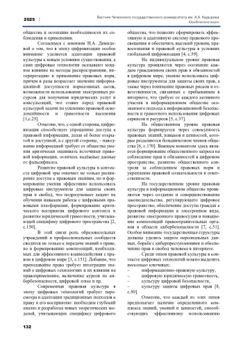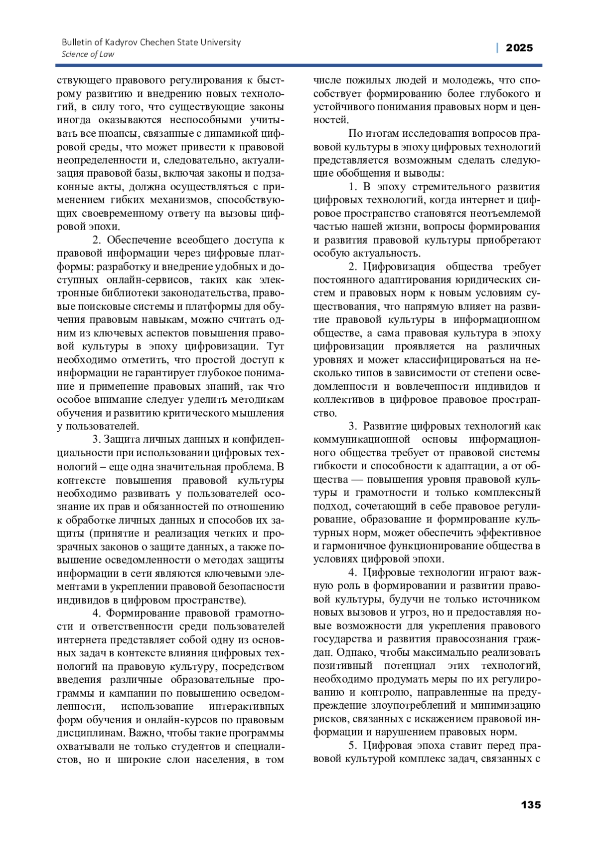 В эпоху стремительного развития информационных технологий, когда границы расстояний стираются, а доступ к информации становится практически неограниченным, особенно значимым становится вопрос о правовой культуре и это не только вопрос нормативного регулирования доступа к информации или защиты данных, но и вопрос формирования социальных отношений в новой реальности. Цифровые технологии, служащие коммуникационной основой современного информационного общества, предъявляют новые требования к правовому регулированию, вызывая необходимость активного реагирования правовой системы на вызовы времени, а цифровизация оказывает влияние на всех участников общественных отношений: от индивидуальных пользователей до крупных корпораций и государственных структур [9, с.156]. От себя добавим, что при этом формируется новая реальность, в которой важную роль играет не только способность к быстрой адаптации к изменениям, но и осознание значимости правовой культуры в цифровом пространстве, а цифровые технологии, таким образом, становятся не только инструментарием для достижения целей, но и фактором, формирующим правовое сознание и культуру.