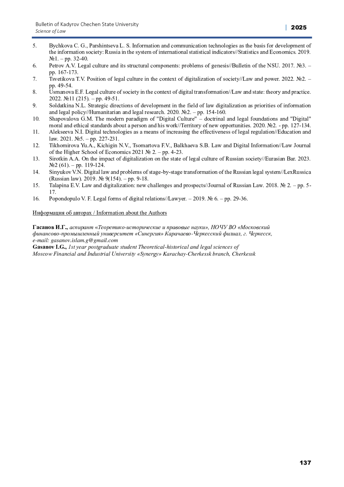 7. Цветикова Т. В. Положение правовой культуры в условиях цифровизации общества // Закон и власть. 2022. №2. - С. 49-54. EDN: ZGZWVV