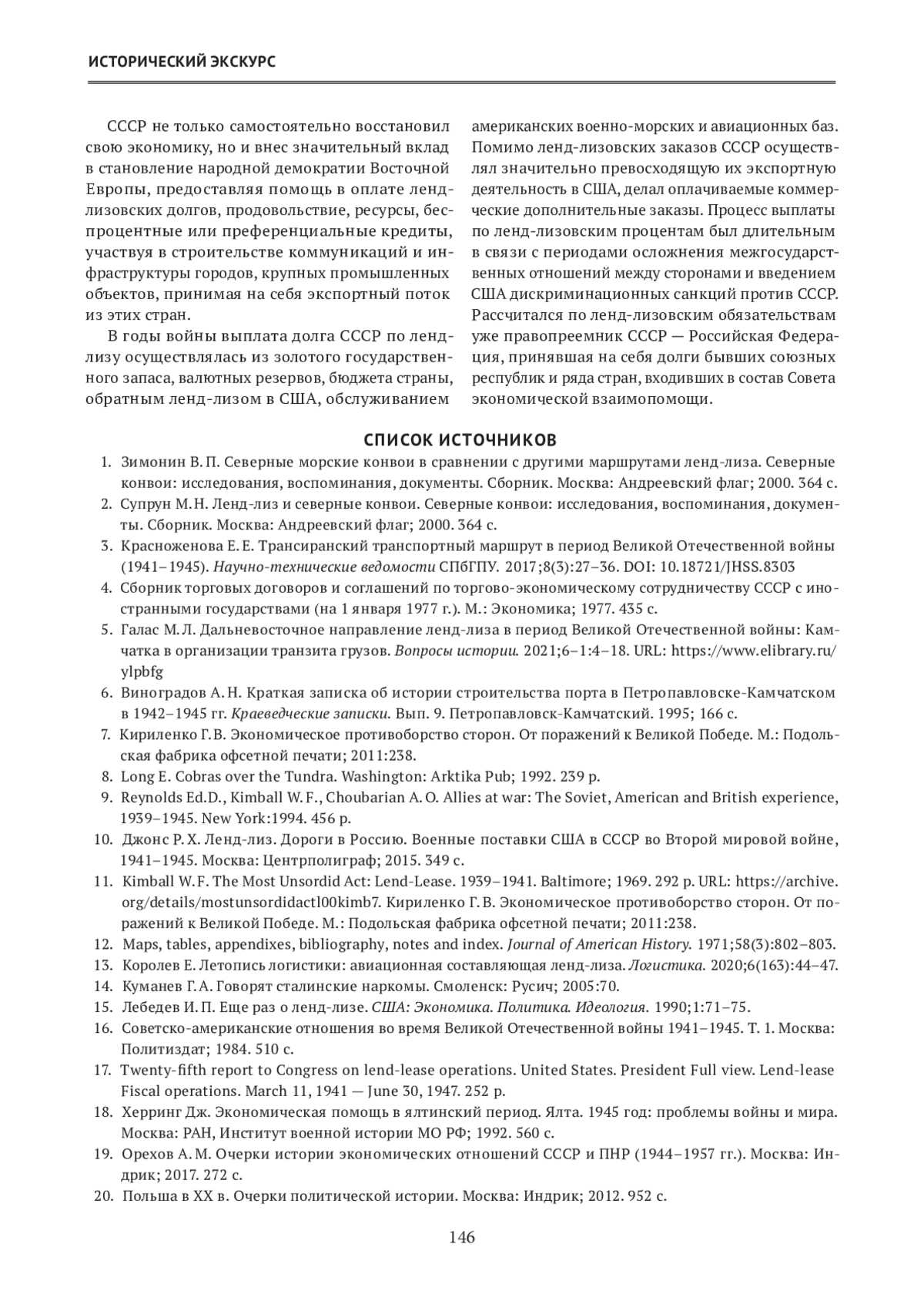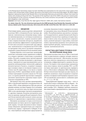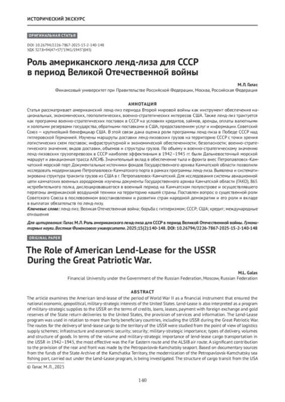 Статья рассматривает американский ленд-лиз периода Второй мировой войны как инструмент обеспечения национальных, экономических, геополитических, военно-стратегических интересов США. Также ленд-лиз трактуется как программа военно-стратегических поставок в СССР на условиях кредитов, займов, аренды, оплаты валютными и золотыми резервами государства, обратными поставками в США, предоставлением услуг и информации. Советский Союз — крупнейший бенефициар США. В этой связи дана оценка роли программы ленд-лиза в Победе СССР над гитлеровской Германией. Изучены маршруты доставки ленд-лизовских грузов на территорию СССР с точки зрения логистических схем поставок; инфраструктурной и экономической обеспеченности; безопасности; военно-стратегического значения; видов доставки, объемов и структуры грузов. По объему и военно-стратегическому значению ленд-лизовских грузоперевозок в СССР наиболее эффективным в 1942–1945 гг. были Дальневосточный морской маршрут и авиационная трасса АЛСИБ. Значительный вклад в обеспечение тыла и фронта внес Петропавловск-Камчатский морской порт. Документальные источники фондов Государственного архива Камчатской области позволили исследовать модернизацию Петропавловск-Камчатского порта в рамках программы ленд-лиза. Выявлена и систематизирована структура транзита грузов из США в г. Петропавловск-Камчатский. Для исследования системы авиационной цепи камчатских военных аэродромов изучены документы Государственного архива Камчатской области (ГАКО), 865 истребительного полка, дислоцировавшегося в военный период на Камчатском полуострове и осуществлявшего перегоны американской воздушной техники на территорию нашей страны. Поставлен вопрос о существенной роли советского союза в послевоенном восстановлении и развитии стран народной демократии и его роли и вкладе в выплатах обязательств по ленд-лизу.