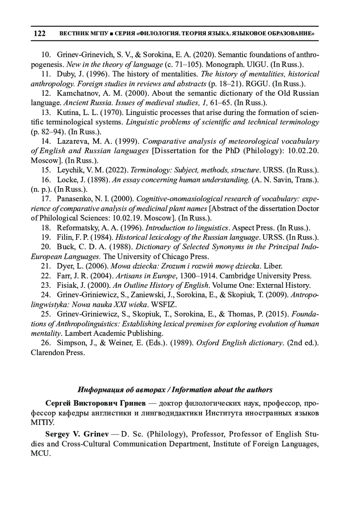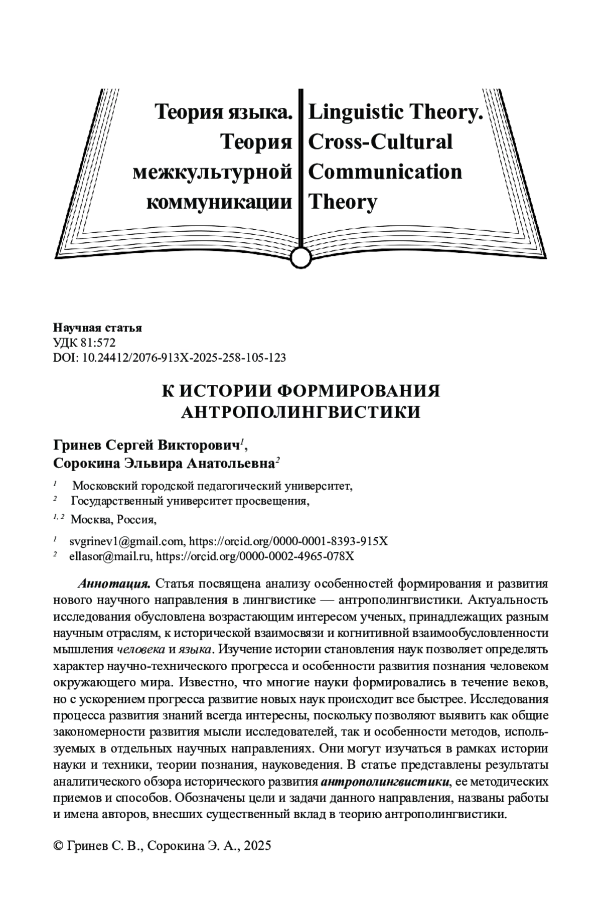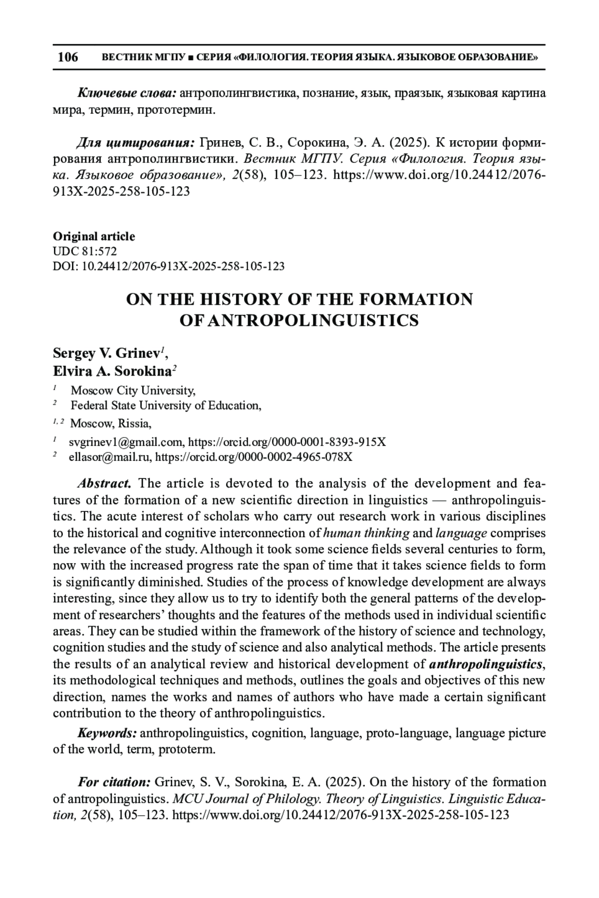 ГРИНЕВ-ГРИНЕВИЧ С. В., СОРОКИНА Э. А. К ИСТОРИИ ФОРМИРОВАНИЯ АНТРОПОЛИНГВИСТИКИ // ВЕСТНИК МГПУ. СЕРИЯ: ФИЛОЛОГИЯ. ТЕОРИЯ ЯЗЫКА. ЯЗЫКОВОЕ ОБРАЗОВАНИЕ. 2025. № 2 (58)