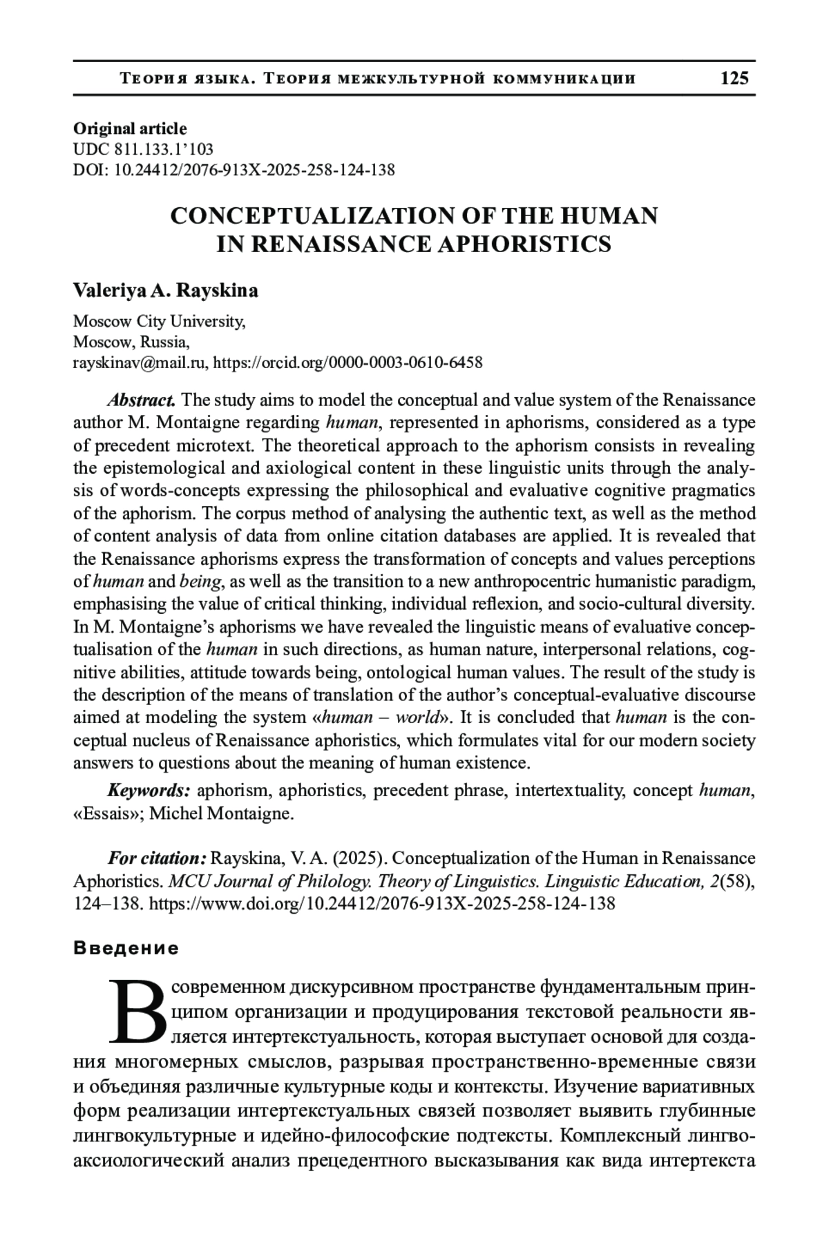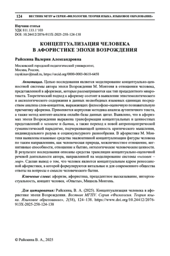 РАЙСКИНА В. А. КОНЦЕПТУАЛИЗАЦИЯ ЧЕЛОВЕКА В АФОРИСТИКЕ ЭПОХИ ВОЗРОЖДЕНИЯ // ВЕСТНИК МГПУ. СЕРИЯ: ФИЛОЛОГИЯ. ТЕОРИЯ ЯЗЫКА. ЯЗЫКОВОЕ ОБРАЗОВАНИЕ. 2025. № 2 (58)