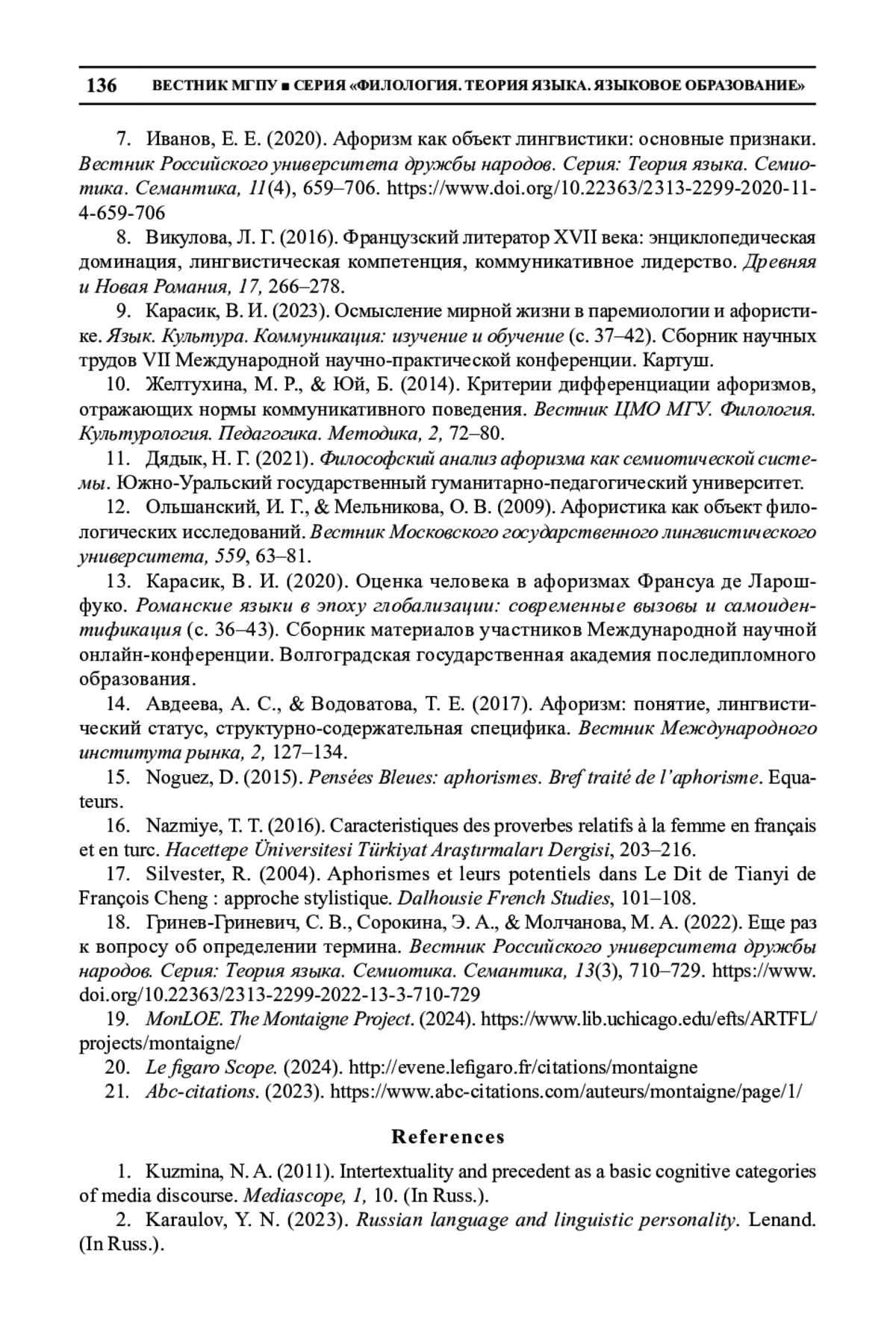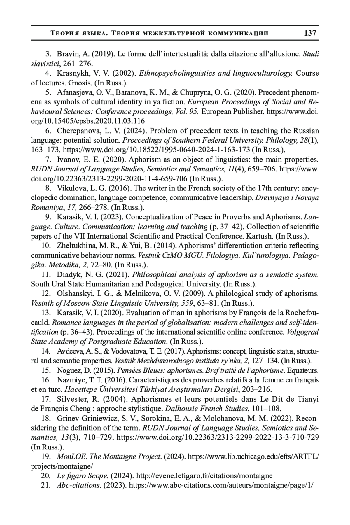 Ключевые фразы: АФОРИЗМ, афористика, прецедентное высказывание, интертекстуальность, концепт человек, «опыты», мишель монтень